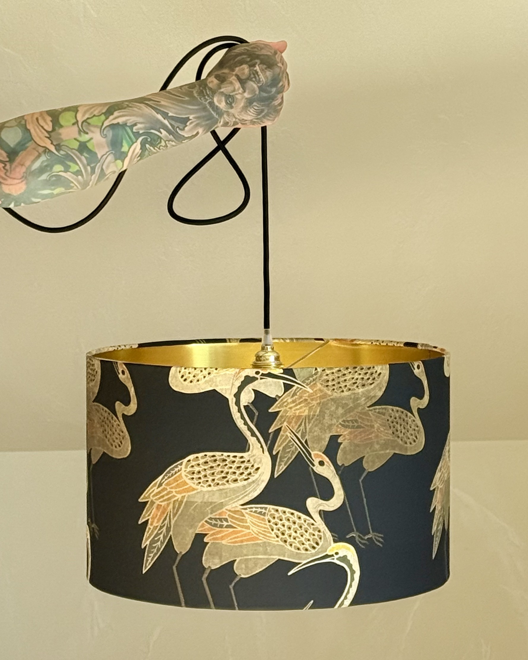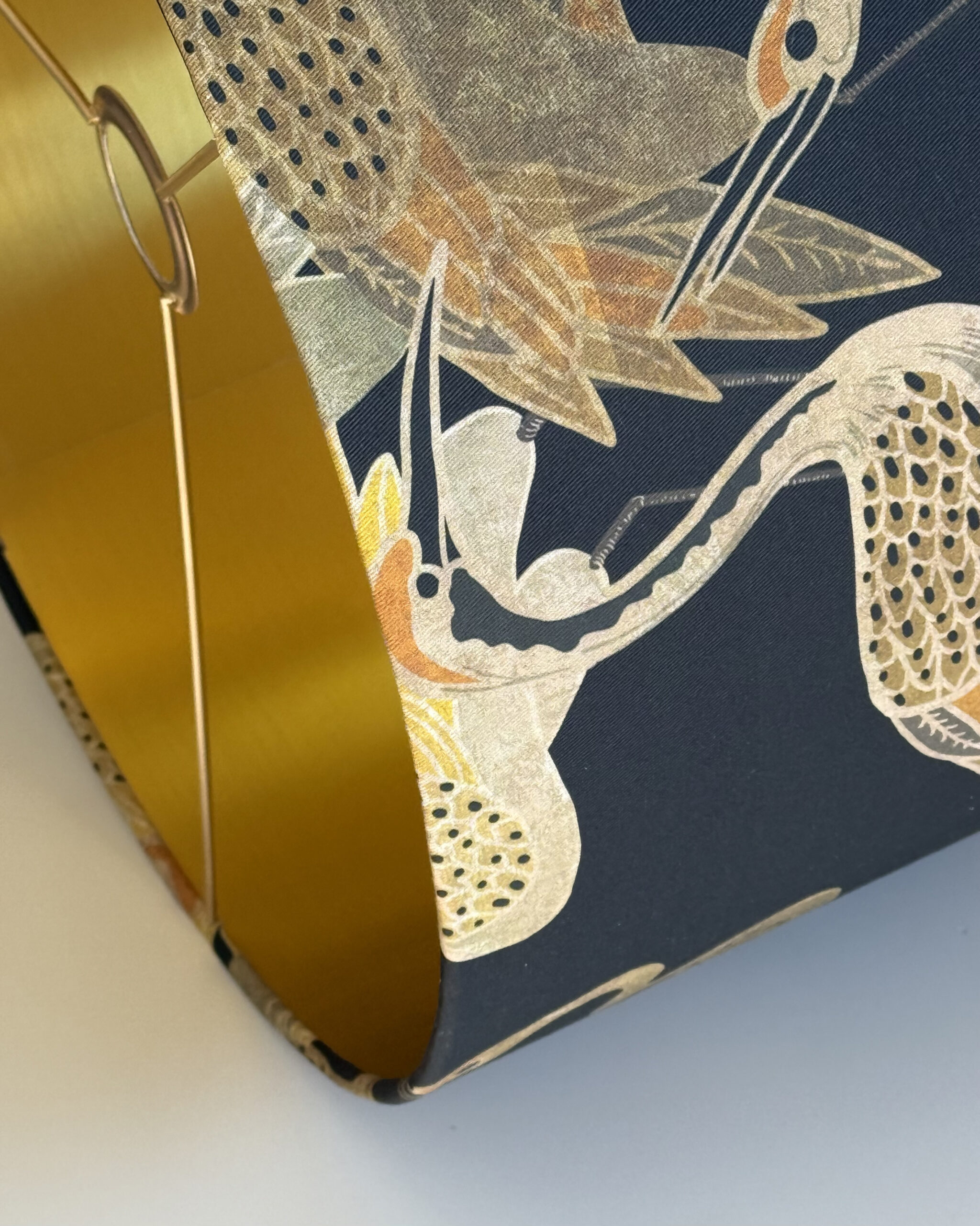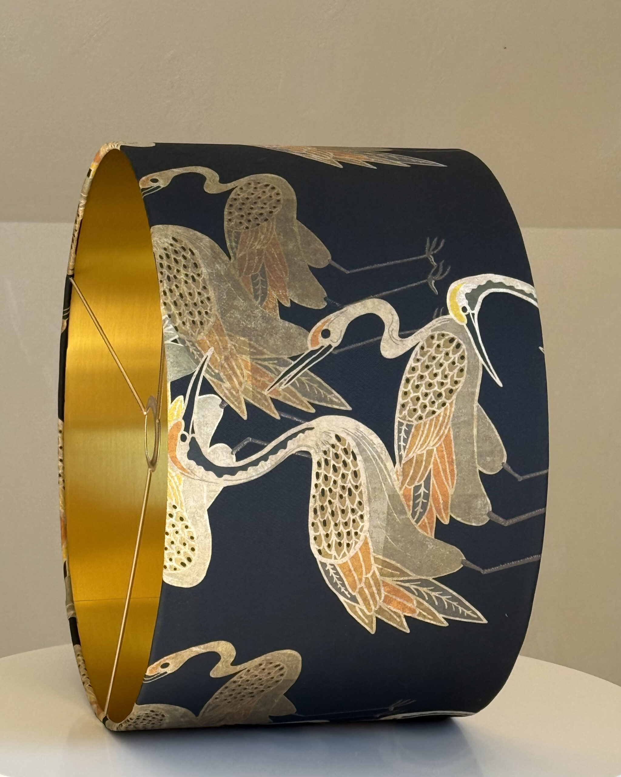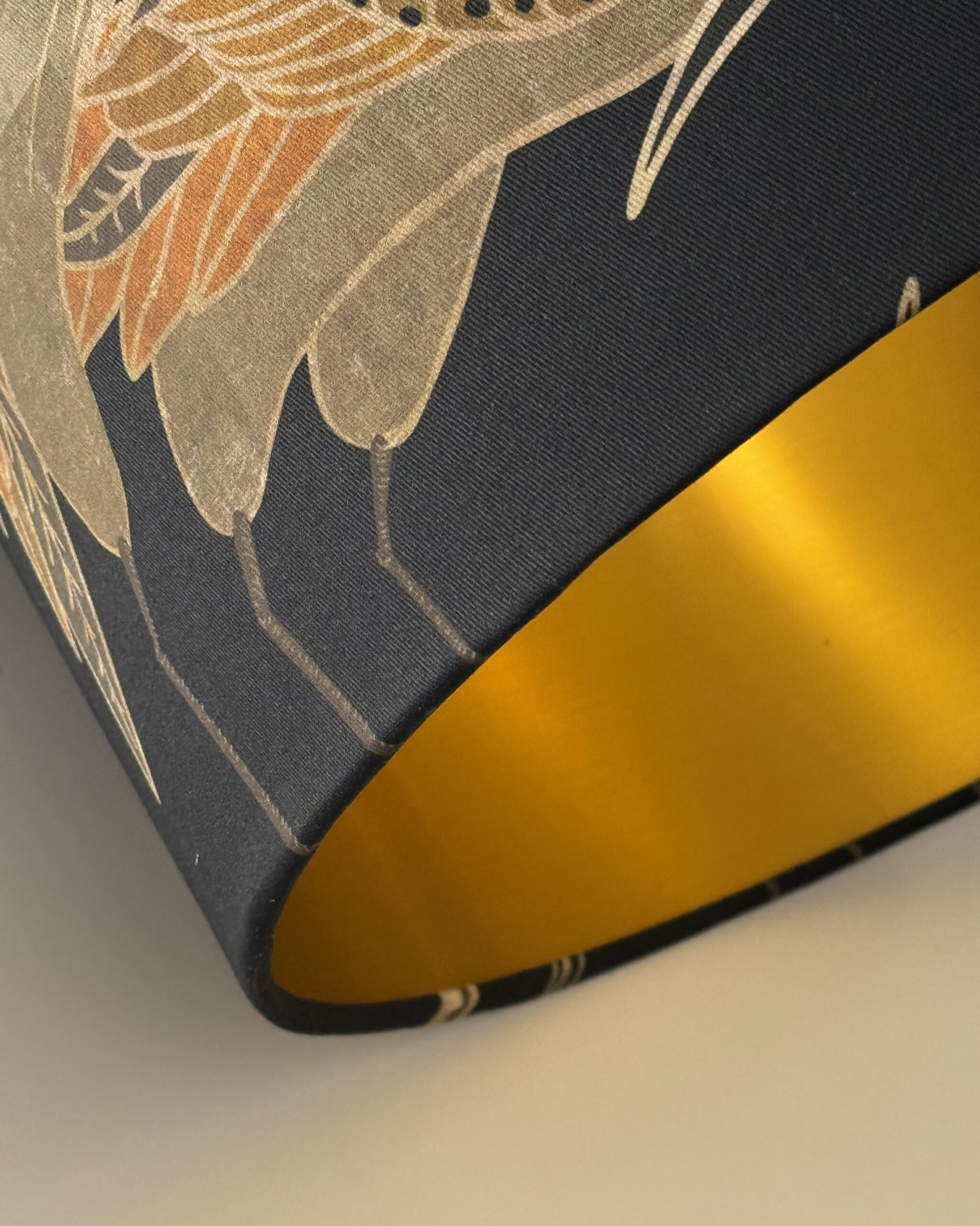 Enhance your interior with this elegant Art Deco Crane Design Gold-Lined Lampshade, a perfect blend of timeless sophistication and modern artistry. Featuring a striking crane motif on a deep black backdrop, this handmade lampshade adds a unique decorative touch to any room. The luxurious brushed gold lining reflects a warm, radiant glow, creating an inviting ambiance that’s ideal for both contemporary and classic interiors. Crafted with premium materials and attention to detail, this versatile lampshade is suitable for table lamps, floor lamps, or pendant lighting.