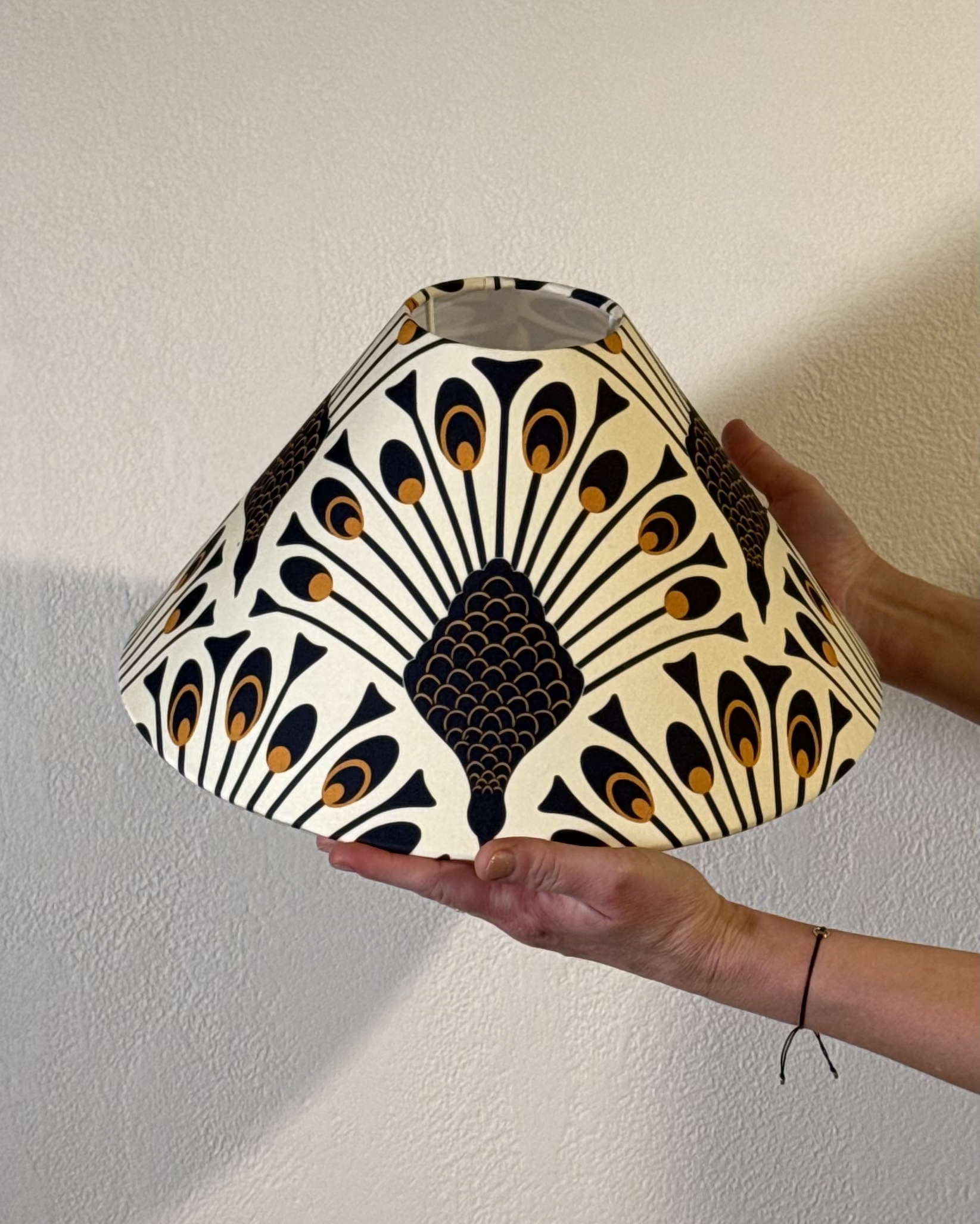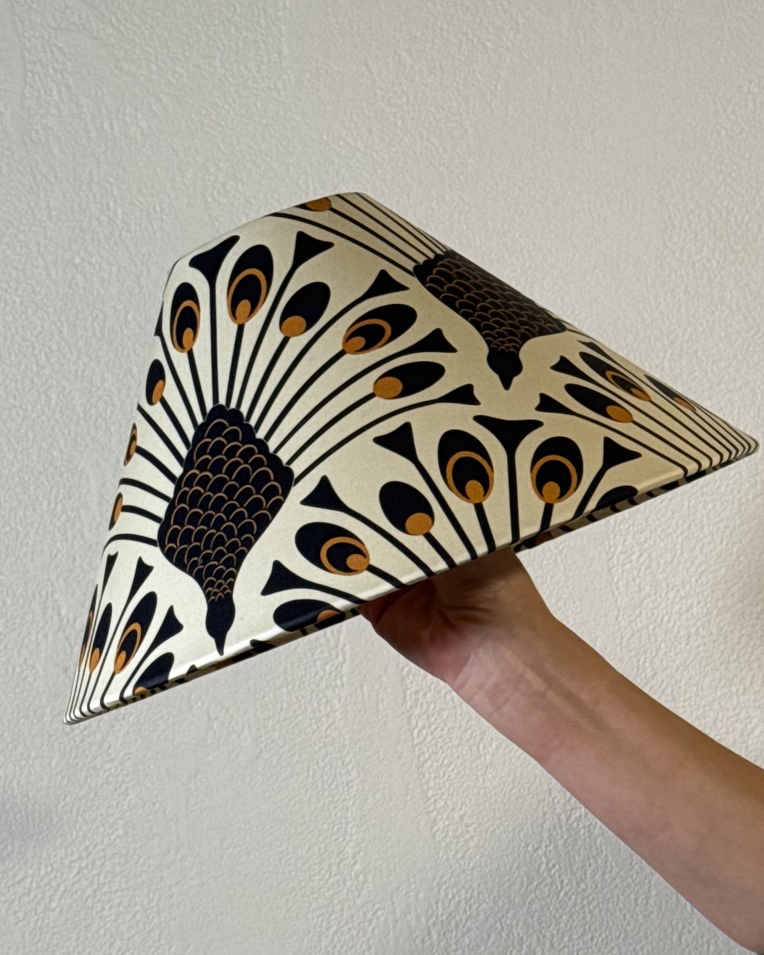 Each Art Deco peacock lampshade is handmade in my studio with careful attention to detail. Fabric placement, shaping, and finishing are thoughtfully executed to ensure a refined and durable result. This is not a mass-produced item, but a made-to-order piece created with craftsmanship and care.