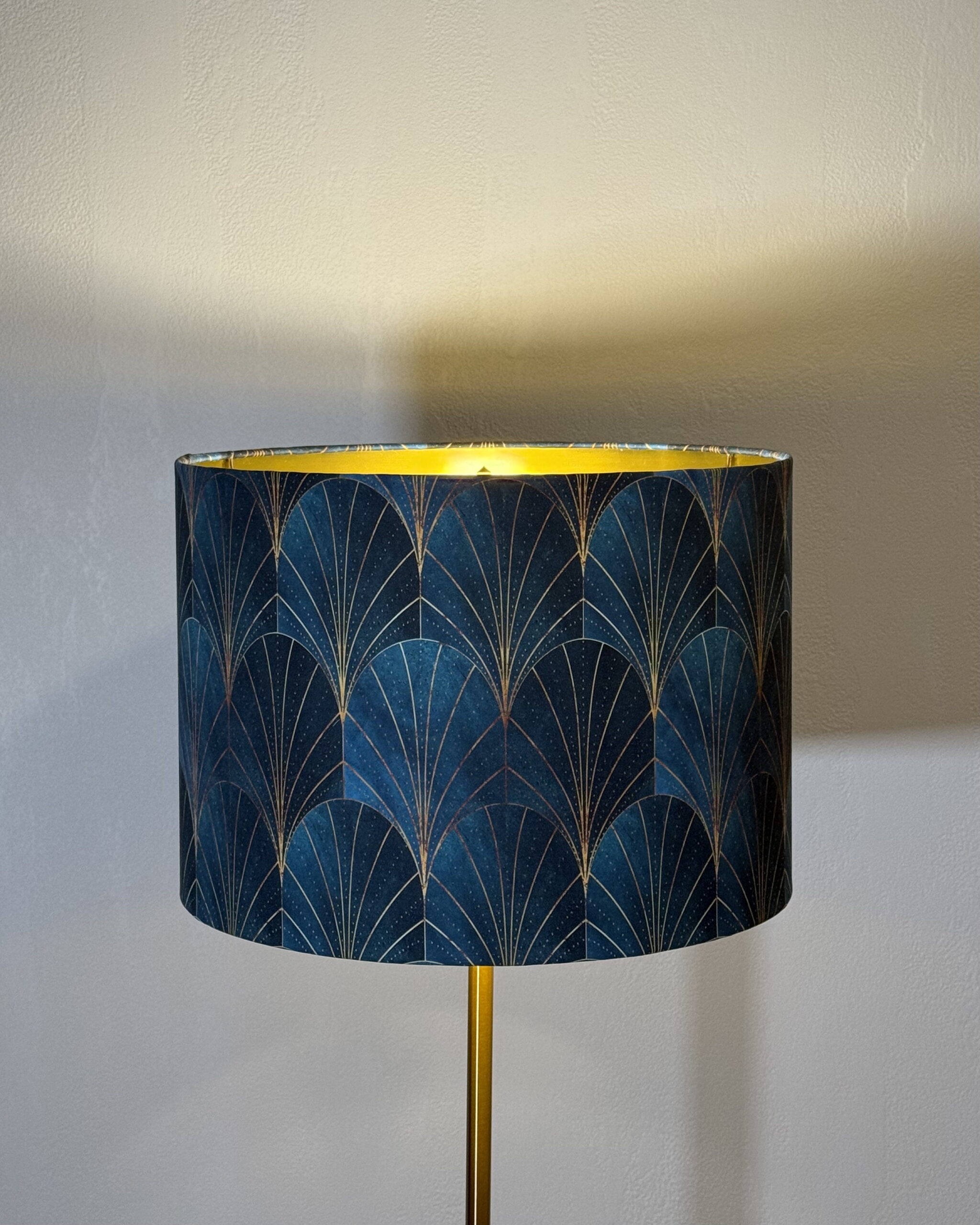 Add a touch of timeless elegance to your home with this stunning Art Deco-inspired lampshade. Featuring a luxurious Waterfalls fabric in rich blue and gold tones, paired with a brushed gold lining, this handmade masterpiece creates a warm and sophisticated glow. Perfect for both modern and classic interiors, it’s a versatile statement piece that enhances any room’s decor.