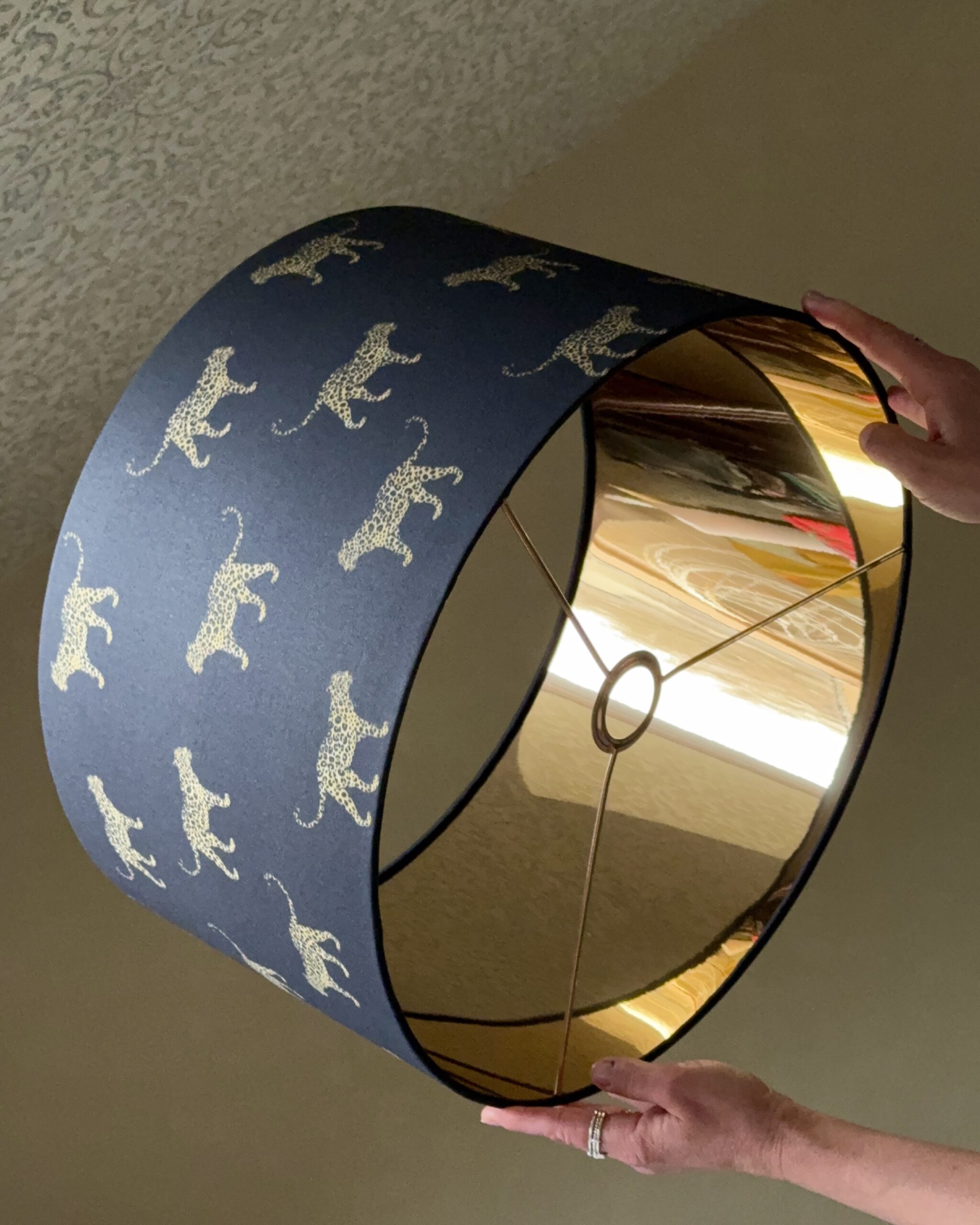 A bold black drum lampshade featuring an elegant leopard pattern and a luxurious mirror gold interior. Creates a warm, dramatic glow and adds modern sophistication to any room. Handcrafted and available in 9 sizes.