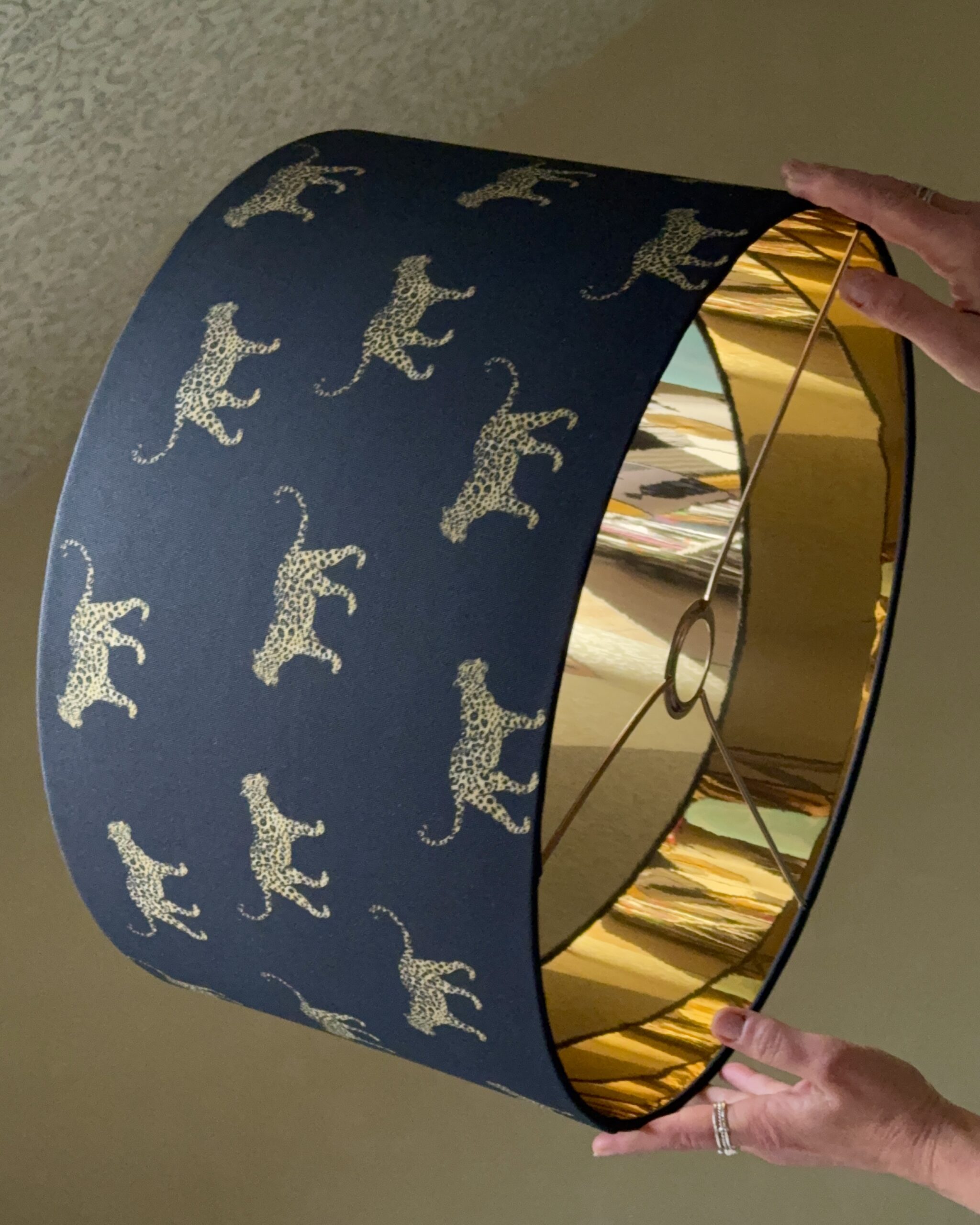 Our gold, silver, champagne and copper-lined lampshades are made using four layers of materials, including the metallic lining, PVC, and your chosen fabric or wallpaper. This ensures that the outer color stays rich and opaque. The light is directional and reflects off the metallic lining, creating a warm glow from the top and bottom of the shade. The amount of light emitted depends on the size of the lampshade—larger shades will provide more light.