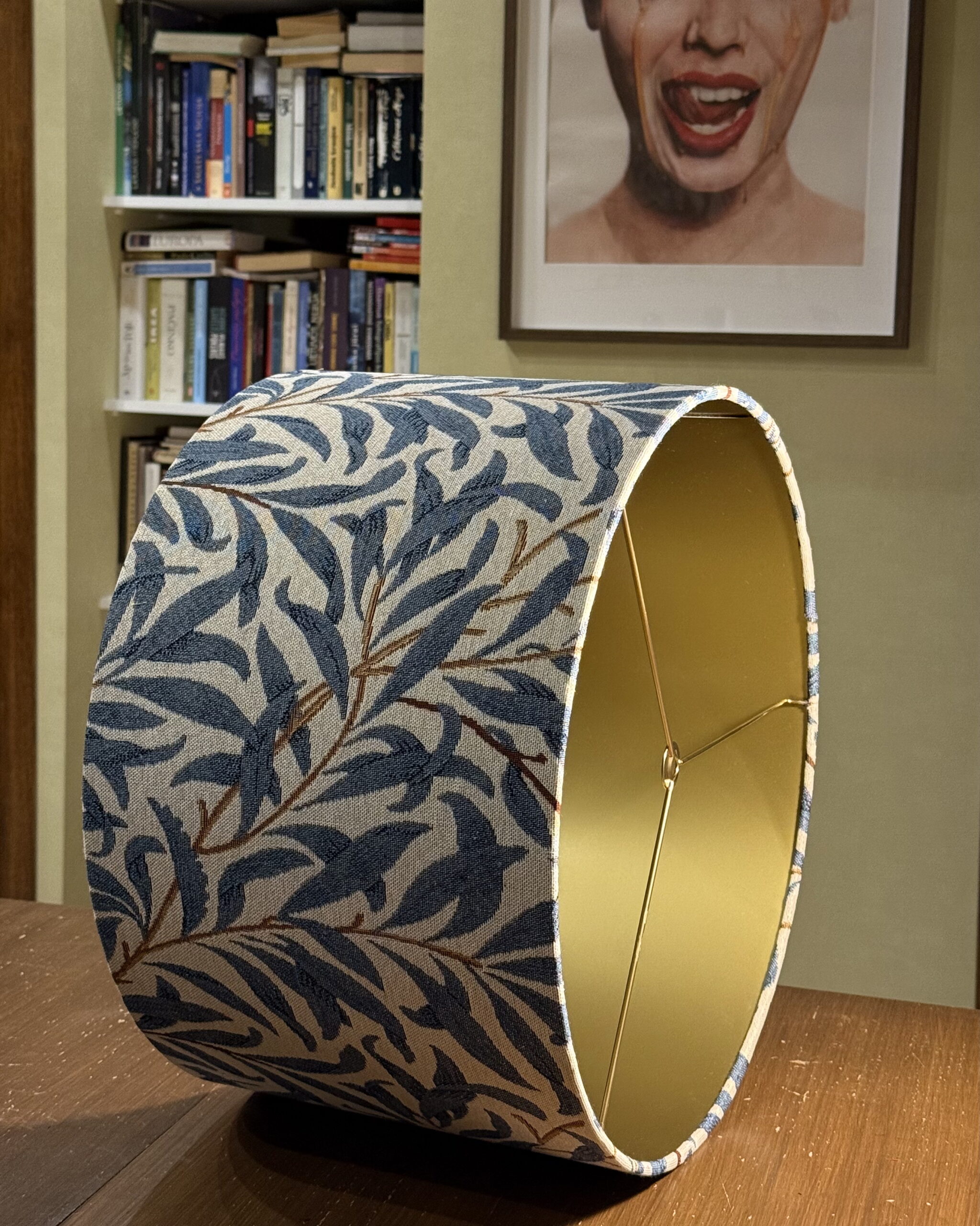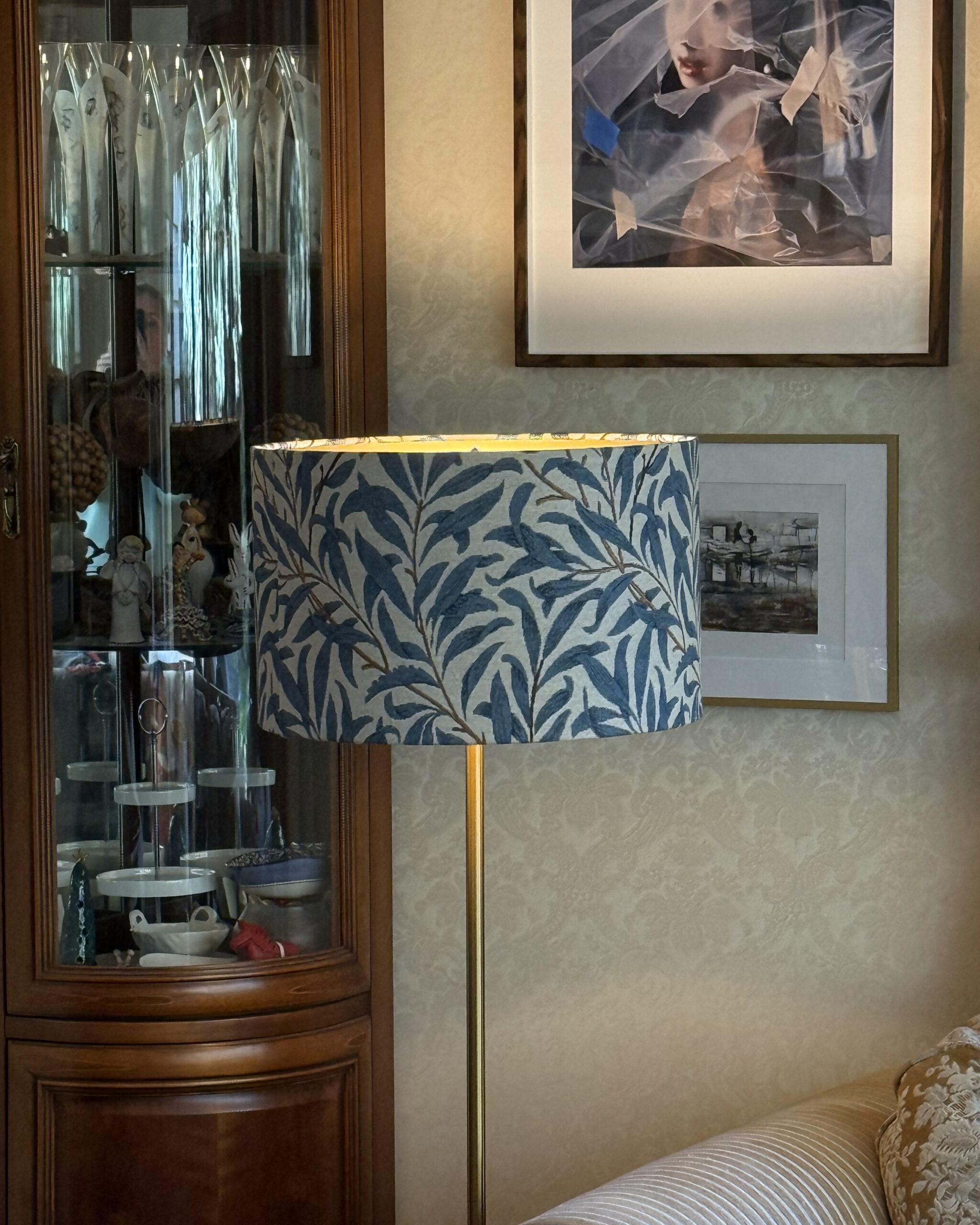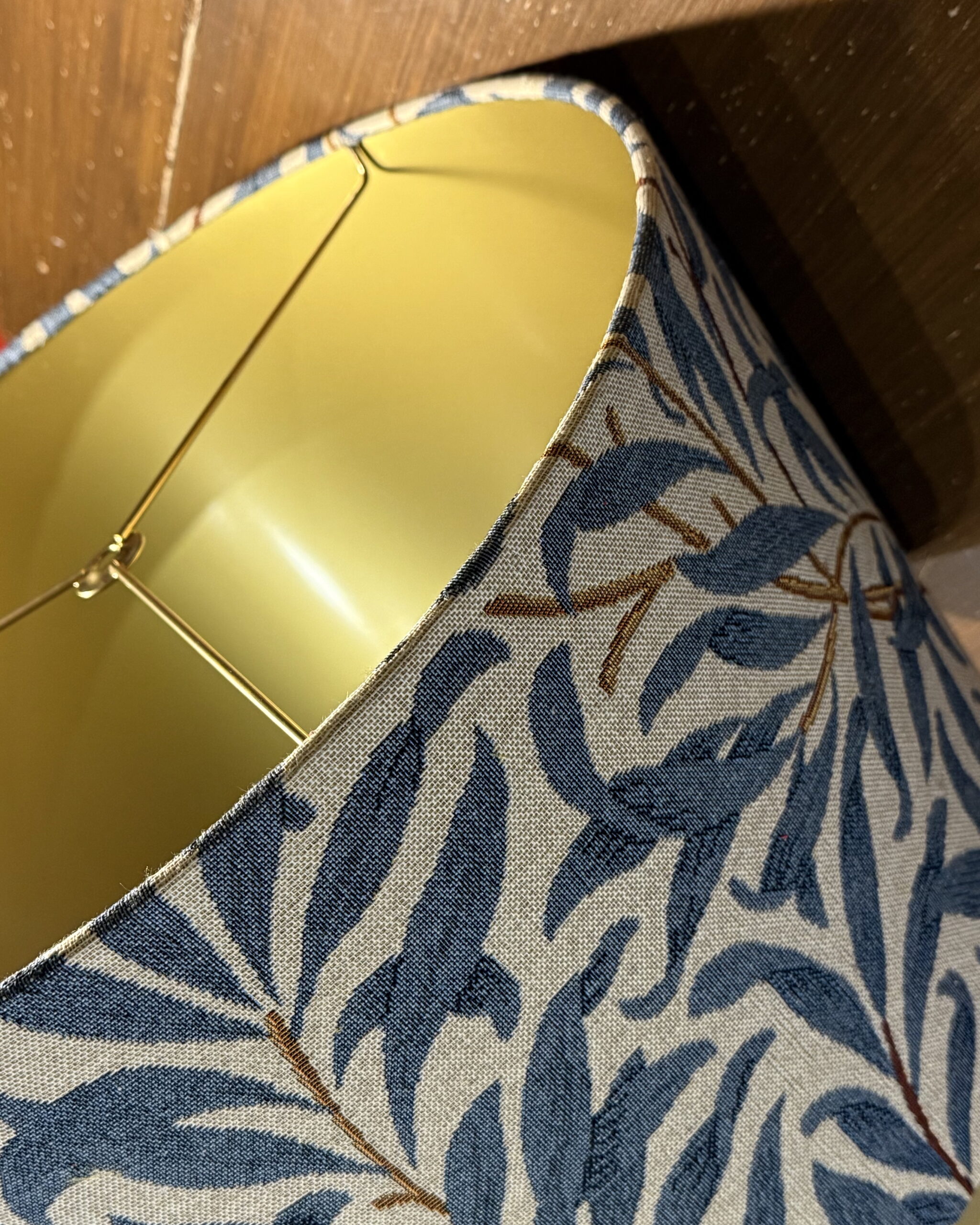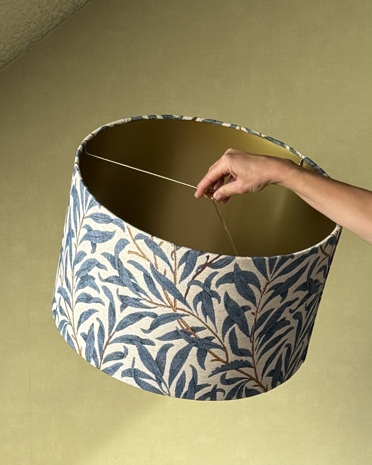 Shades of blue willow leaves meet the soft glow of matte gold –  a lampshade that brings nature and elegance together. Available in 5 sizes, this handmade lampshade works beautifully for table lamps, floor lamps, or as a ceiling shade. Perfect for adding natural charm with a touch of luxury to modern and traditional homes alike.