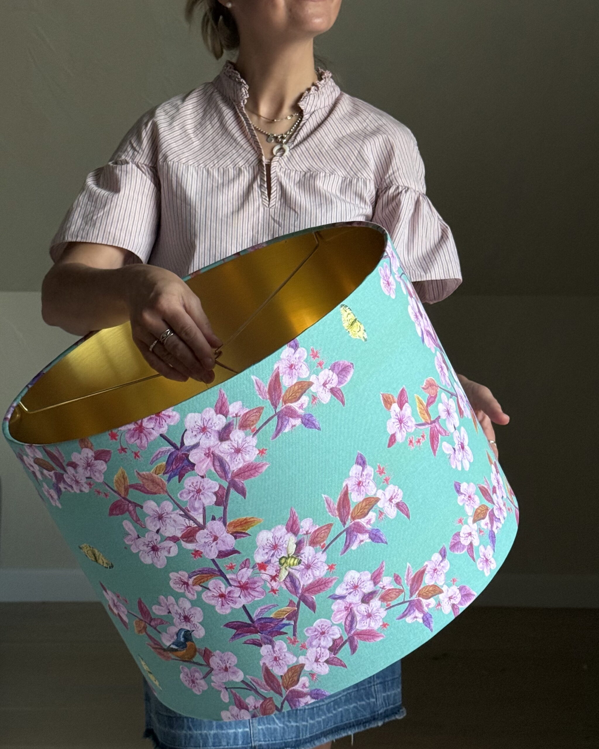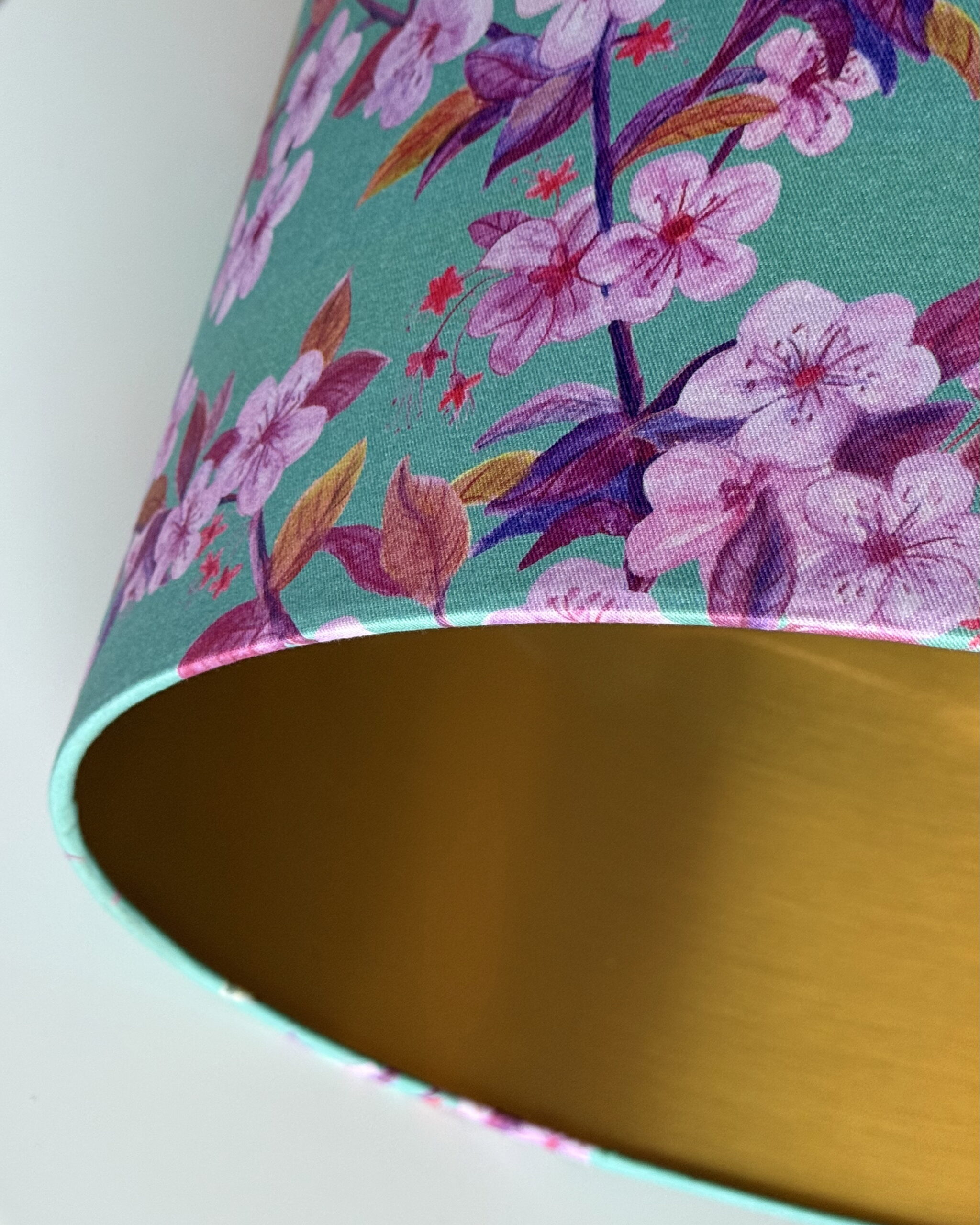 Bring a touch of spring indoors all year round with our Cherry Blossom & Bees Aqua Gold-Lined Lampshade.Handcrafted with a vibrant aqua background and delicate pink cherry blossoms buzzing with golden bees, this statement piece is perfect for adding freshness and charm to any room. The brushed gold lining casts a warm, luxurious glow, enhancing your evening ambience. Ideal for ceiling, table, or floor lamps, it’s available in 9 sizes to suit your space.
