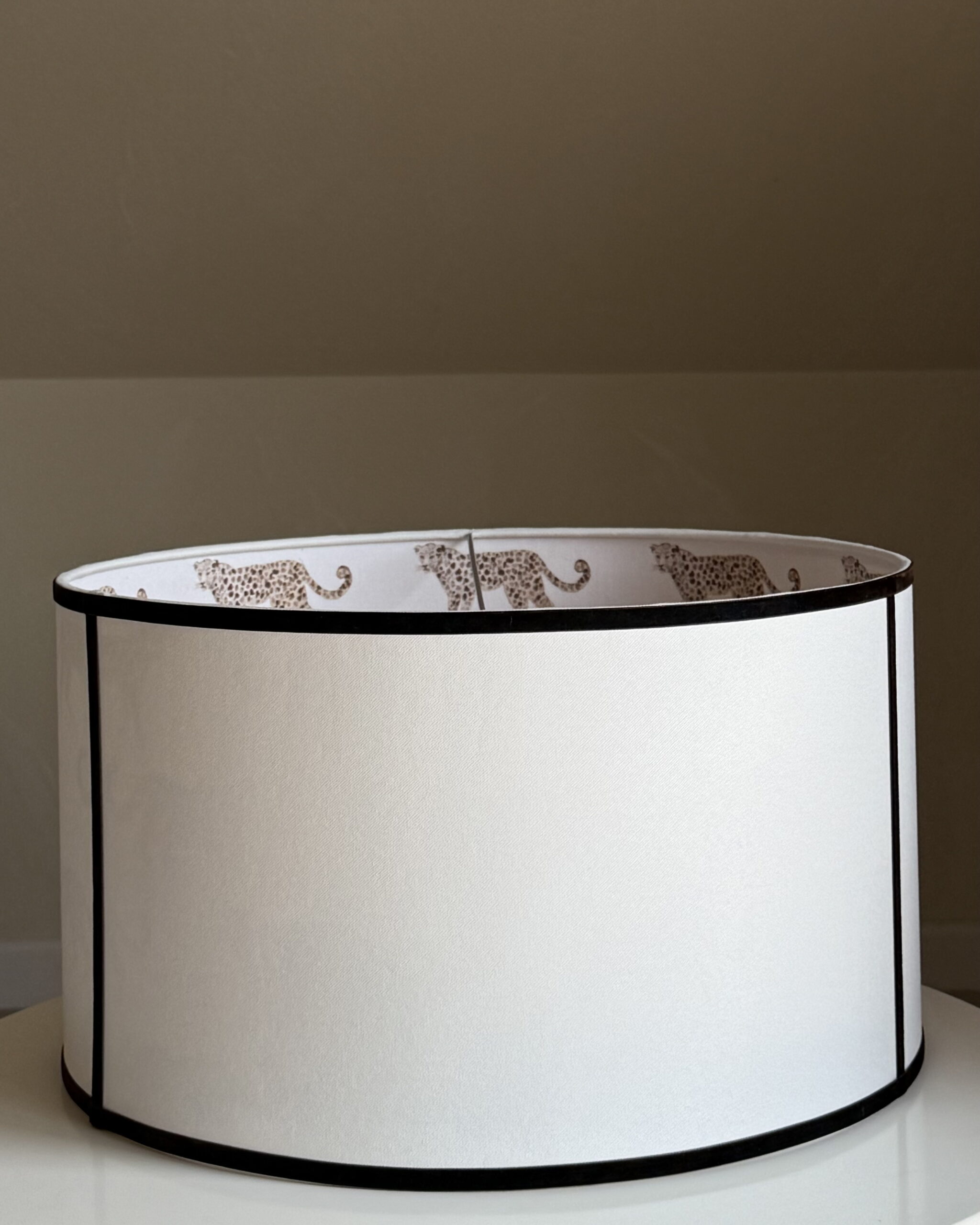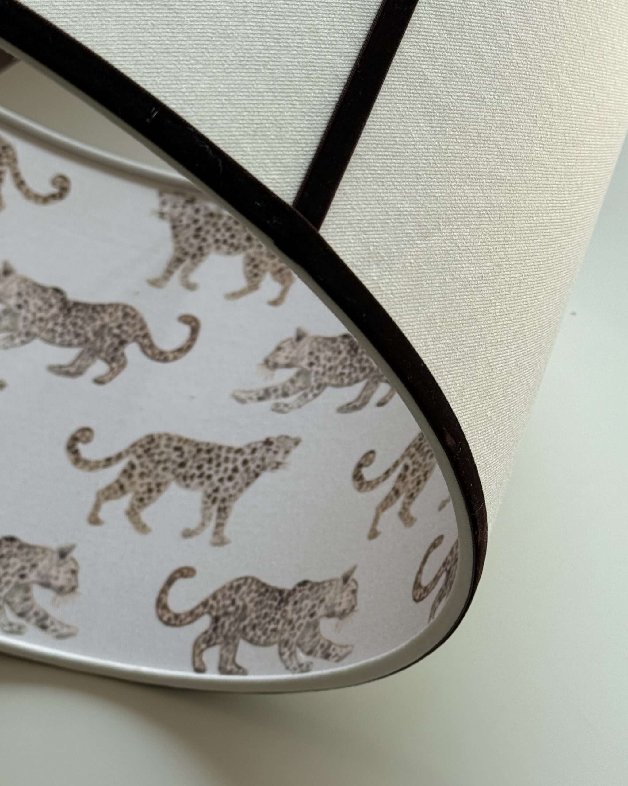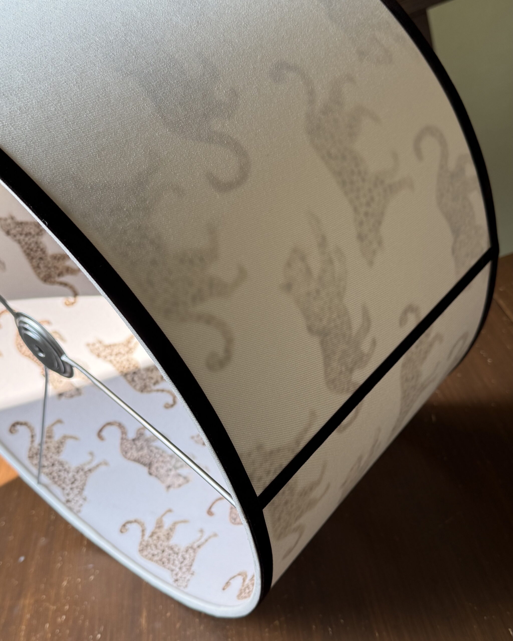 Enhance your home decor with this luxurious double-sided lampshade, featuring a sleek outer fabric complemented by the striking Leopard Parade design on the interior. This unique combination adds a sophisticated and playful touch to any room, perfect for modern, eclectic, or classic interiors. When lit, the lampshade reveals the intricate Leopard Parade pattern, creating a warm and inviting ambiance. Expertly handcrafted using premium materials, this lampshade is designed to deliver elegance and functionality.