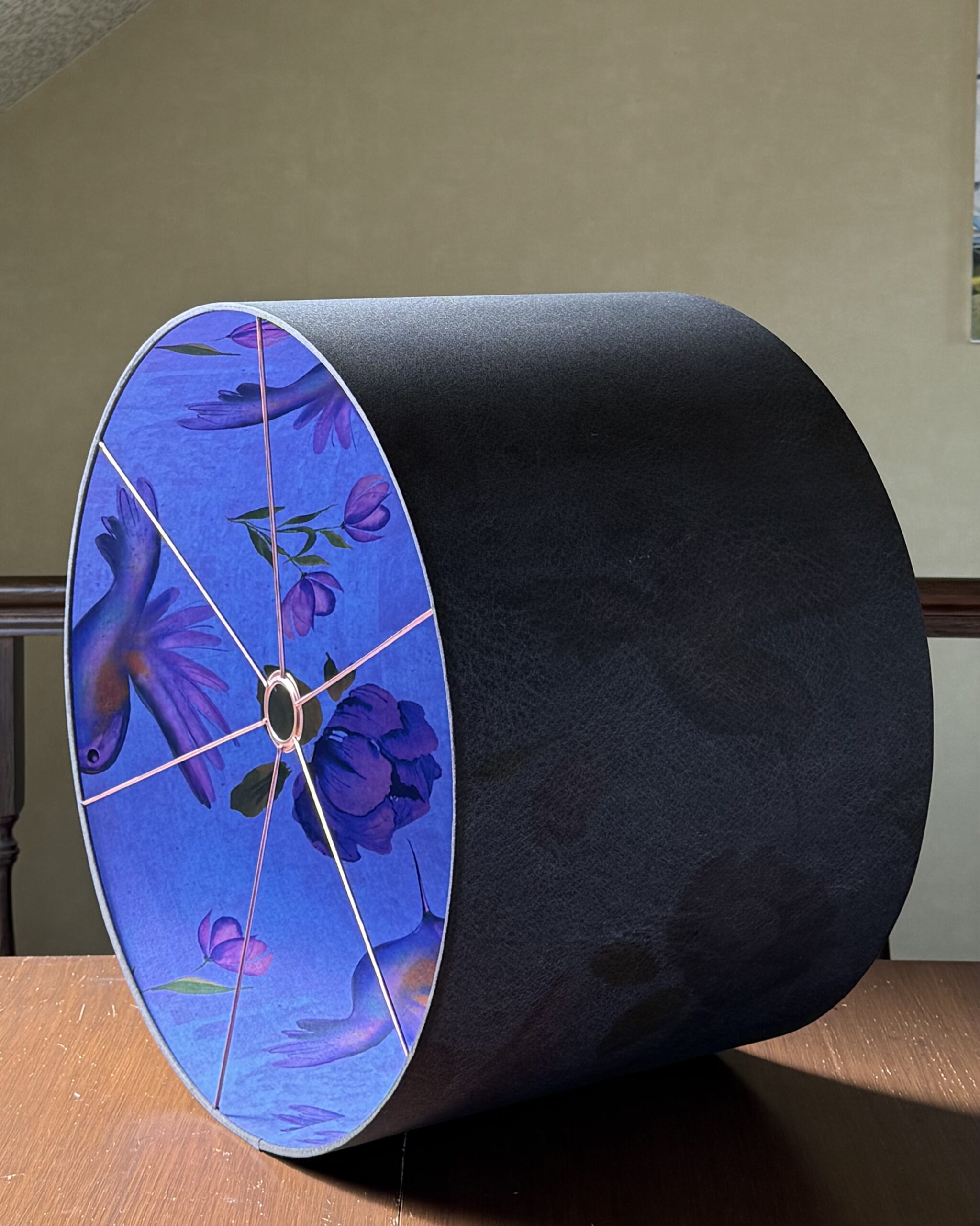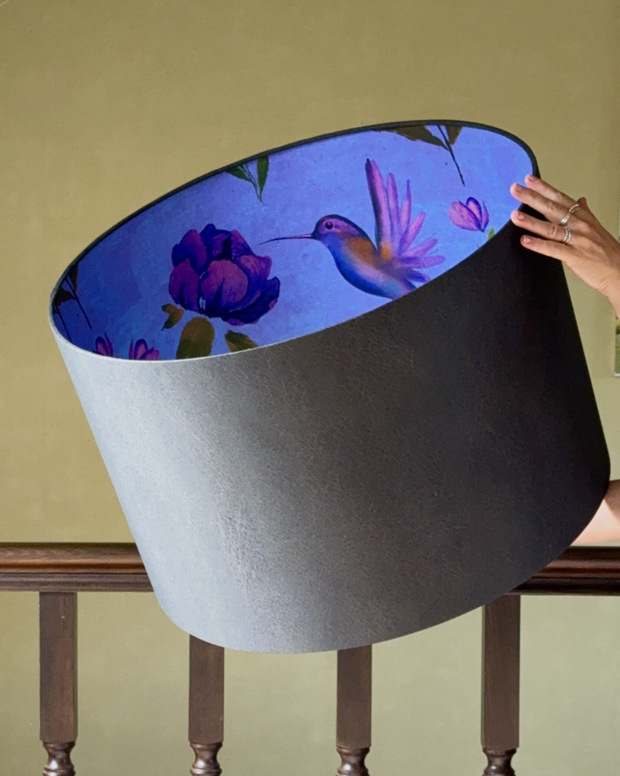Our gold, silver, champagne and copper-lined lampshades are made using four layers of materials, including the metallic lining, PVC, and your chosen fabric or wallpaper. This ensures that the outer color stays rich and opaque. The light is directional and reflects off the metallic lining, creating a warm glow from the top and bottom of the shade. The amount of light emitted depends on the size of the lampshade—larger shades will provide more light.