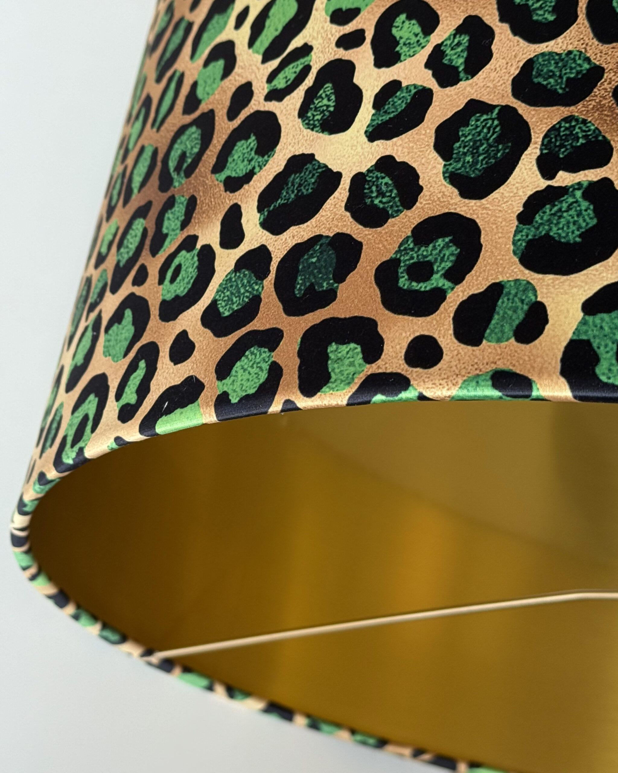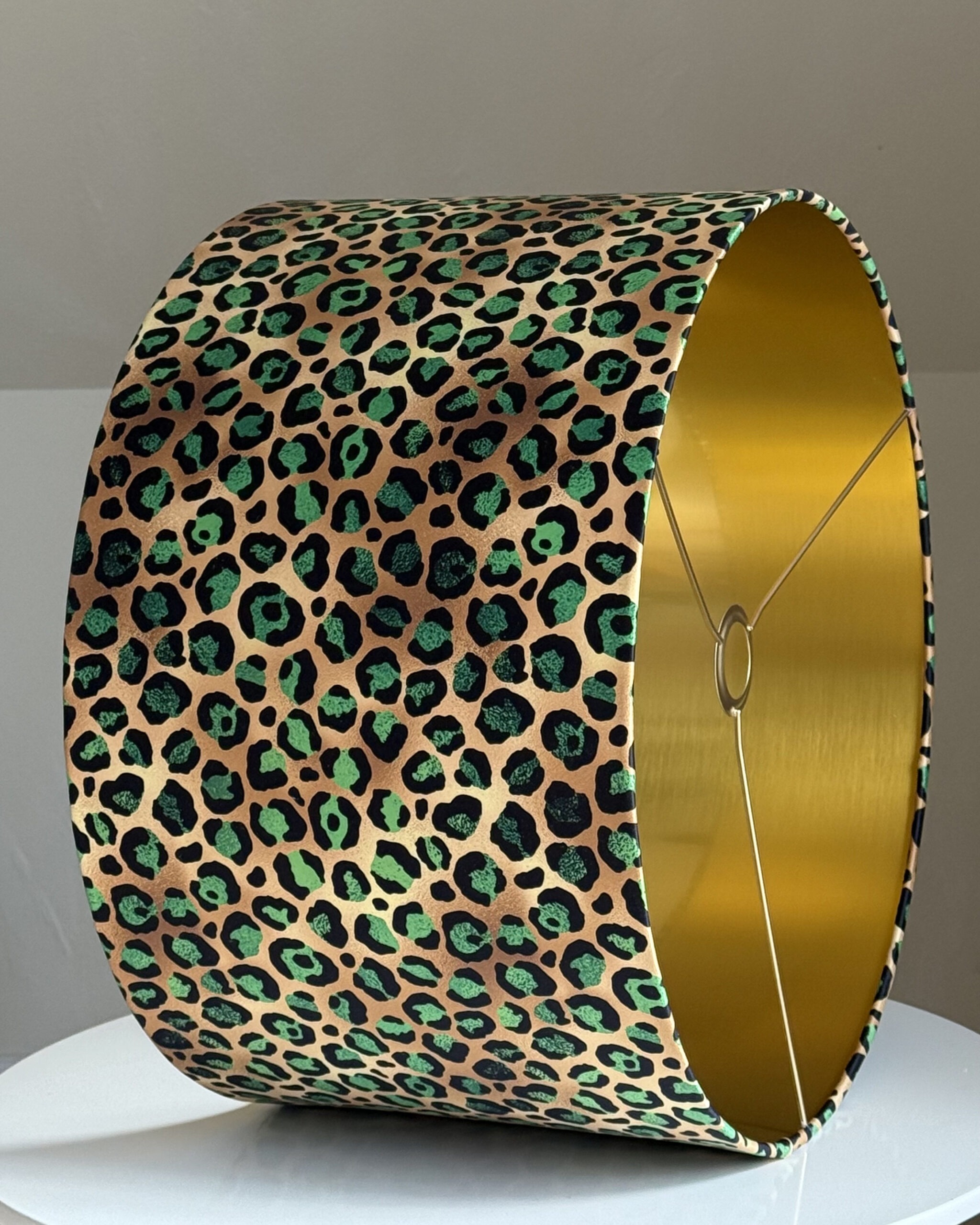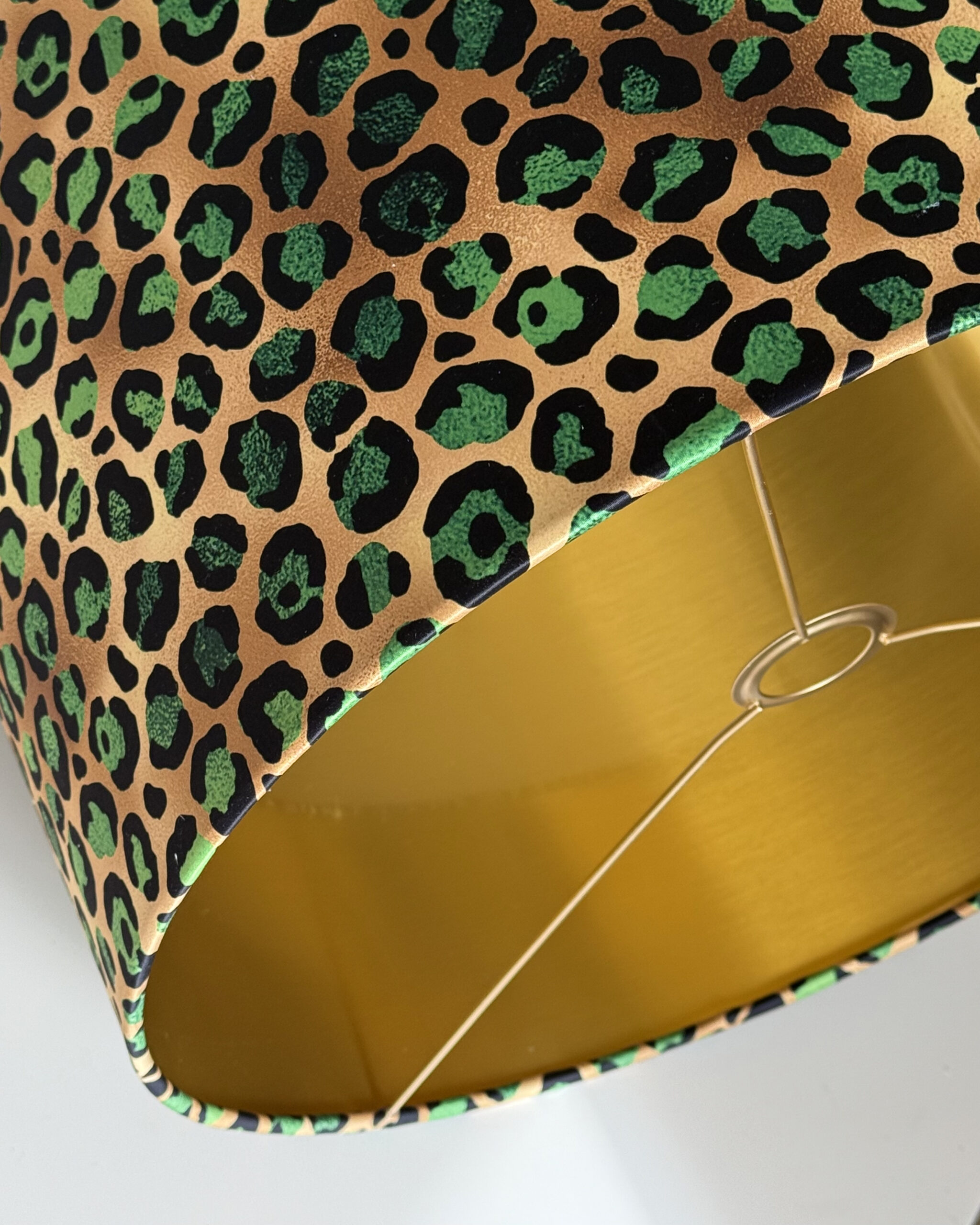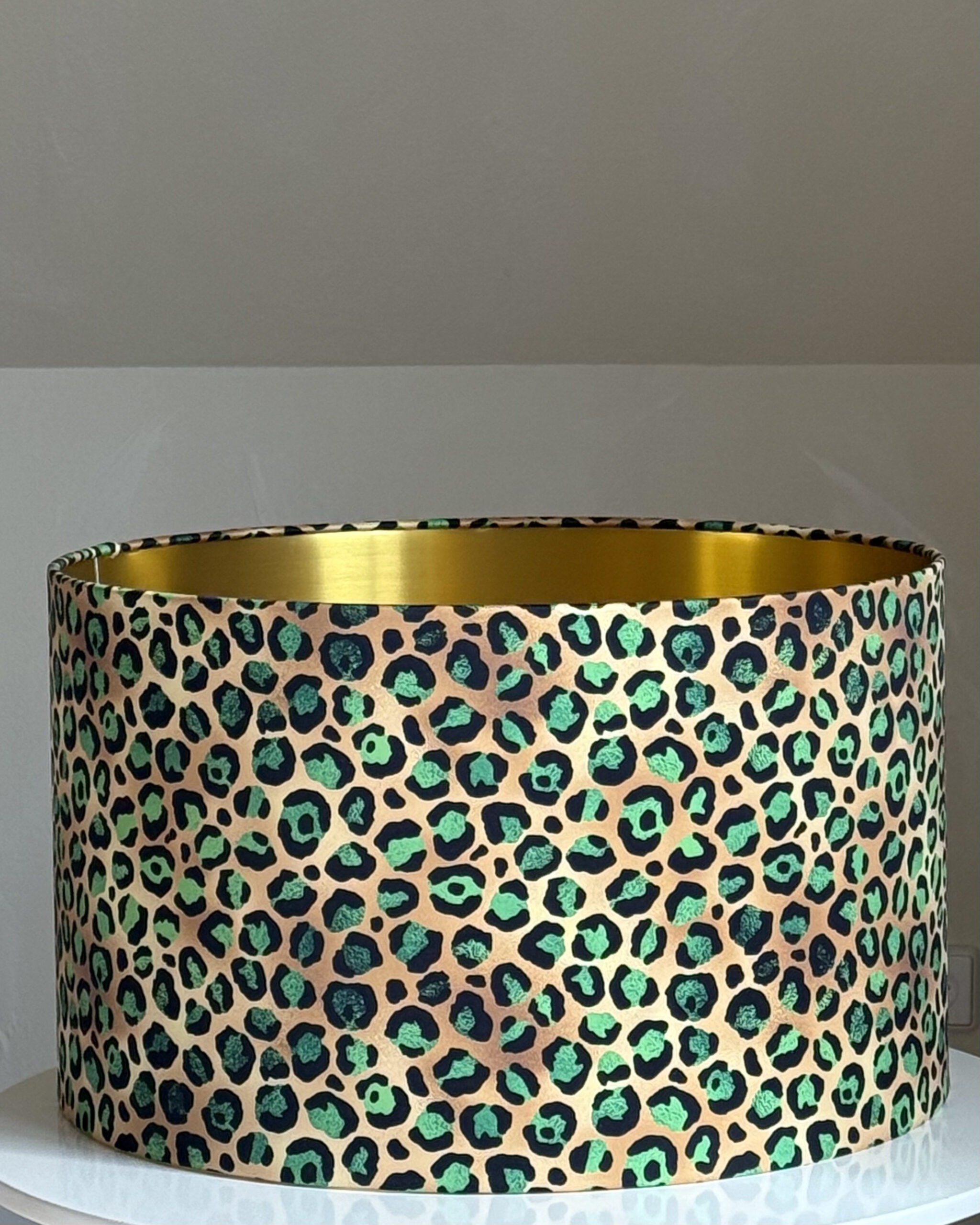 Unleash bold elegance with this Emerald Green Leopard Print Gold Lampshade – where wild luxury meets sophisticated style! Featuring a striking emerald and black leopard pattern, this eye-catching design is lined with opulent brushed gold, casting a warm and radiant glow. Perfect for modern, glam, or eclectic interiors, this handmade lampshade transforms any space into a statement of fierce elegance. Whether you’re styling a ceiling light, table lamp, or floor lamp, this show-stopping piece adds a bold touch of personality.