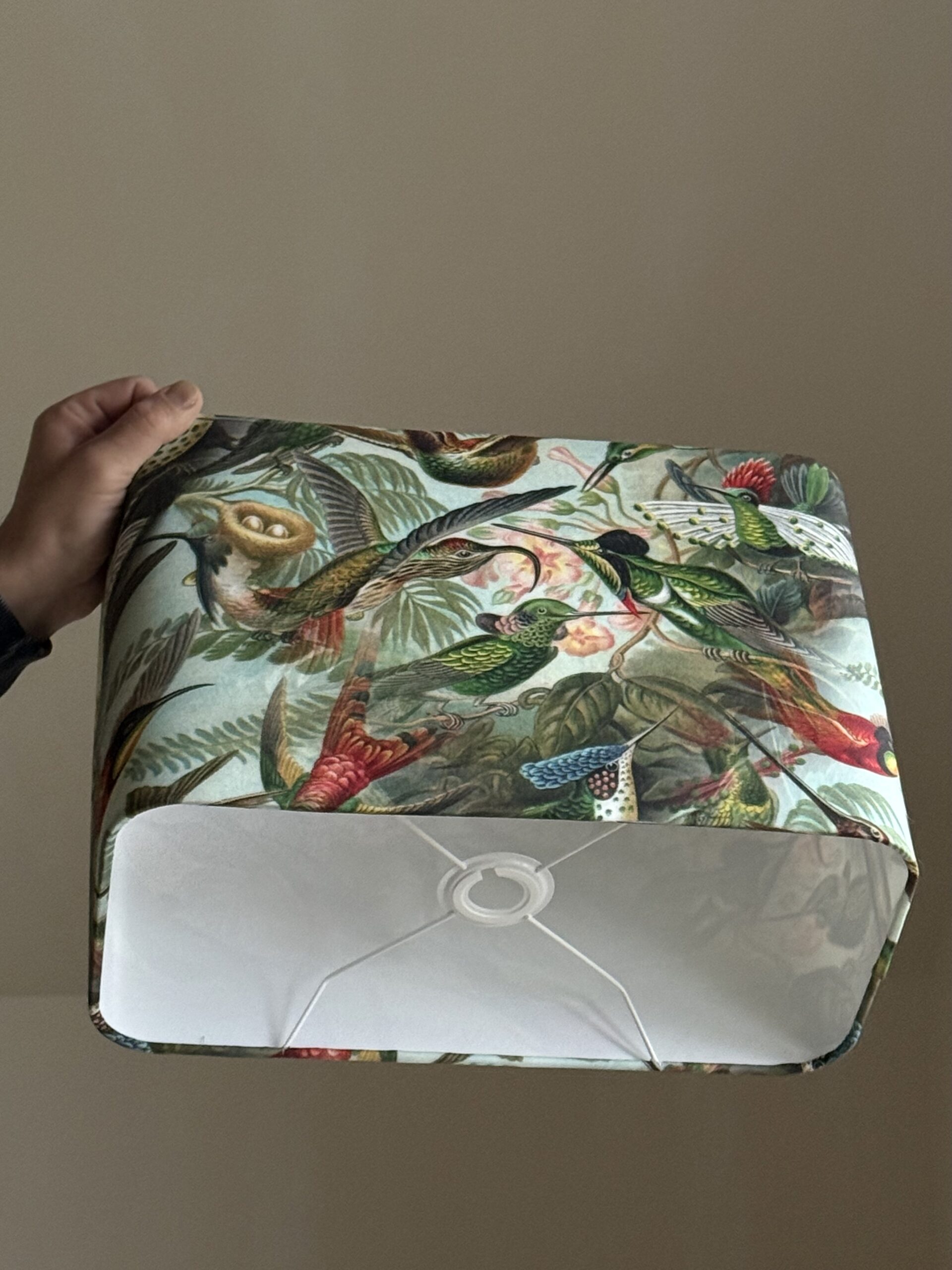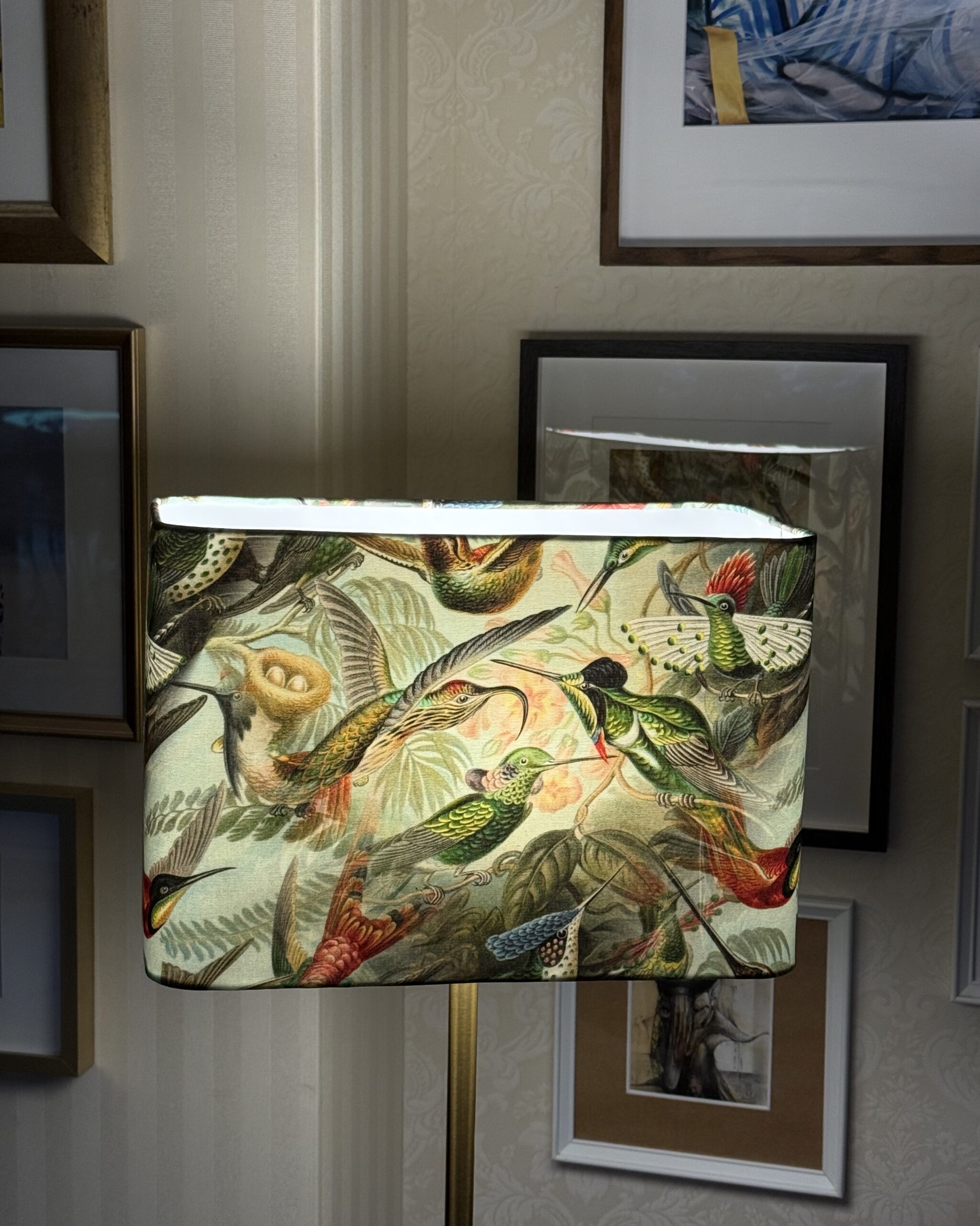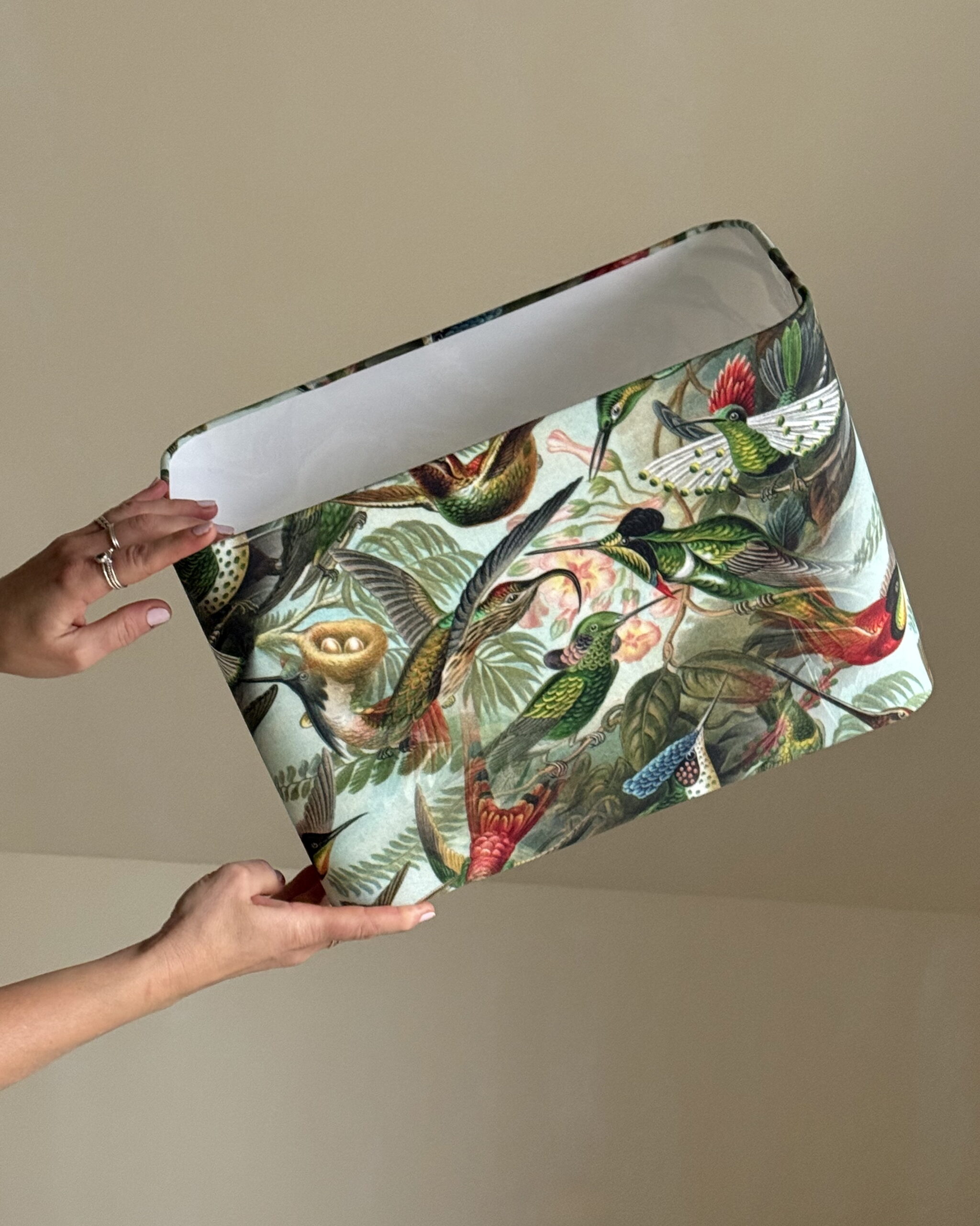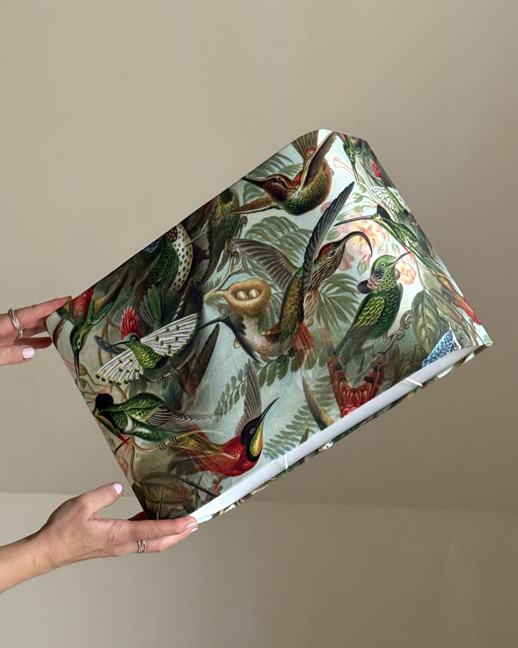 Exotic Bird Paradise white-lined rounded rectangle lampshade is a vibrant, artistic lighting piece designed to bring colour, depth, and a touch of tropical beauty into any home. This handcrafted lampshade features a detailed tropical bird lampshade, hummingbird print inspired by vintage illustrations, filled with graceful wings, lush greenery, and delicate floral accents. Every angle reveals new details, making it a statement décor piece both during the day and when illuminated in the evening.