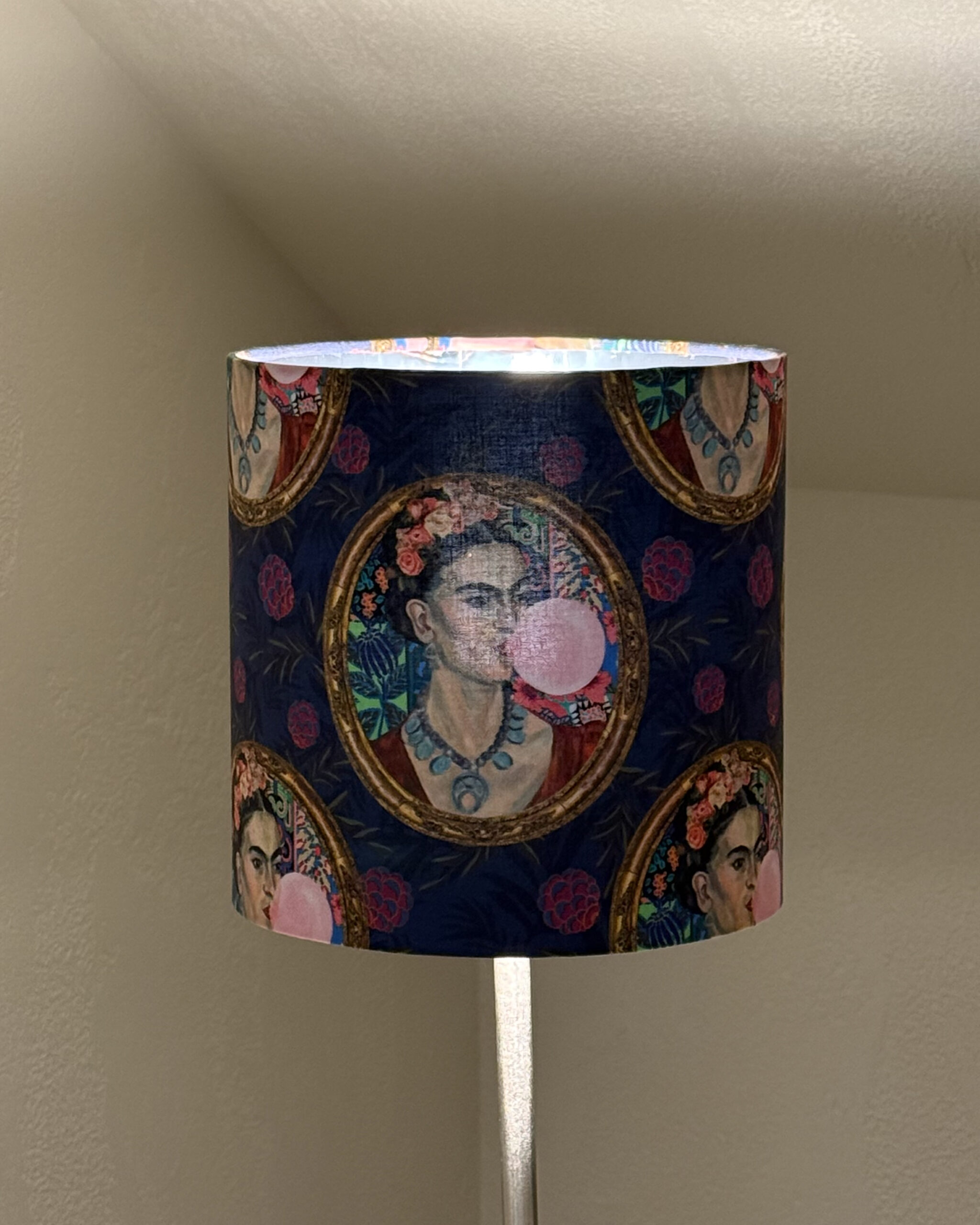 Add a bold and artistic touch to your space with this Frida Bubblegum Pop Art Lampshade, featuring a playful and modern take on Frida Kahlo. The vibrant deep blue background, adorned with gold-framed Frida portraits blowing pink bubblegum, creates a striking pop art aesthetic. Lined with luxurious mirror silver, this lampshade enhances light reflection, creating a bright and contemporary glow in any room.