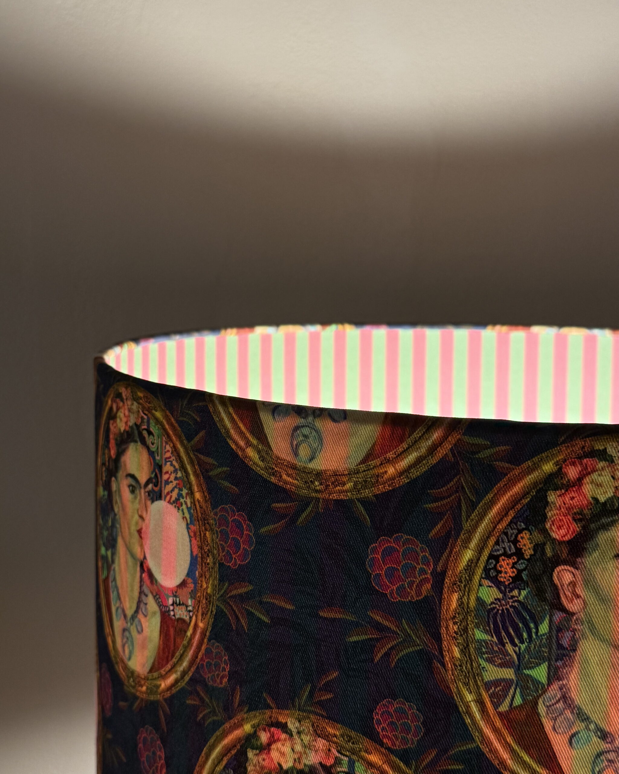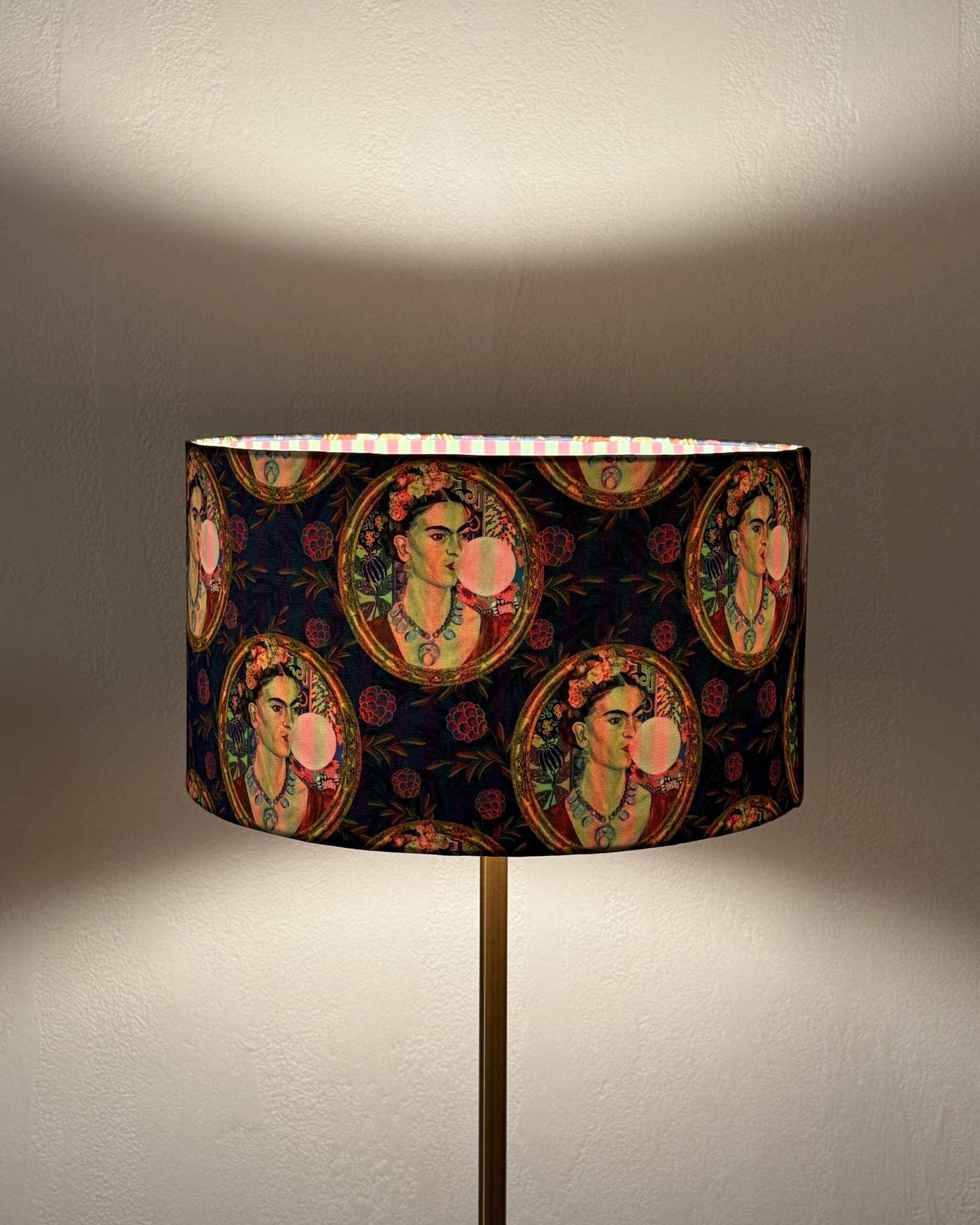 Bring bold artistry and vibrant charm to your space with this stunning double-sided lampshade. Featuring a unique pop art design of Frida Kahlo blowing bubblegum on a deep blue background, this statement piece is perfect for lovers of eclectic and modern interiors. The inner lining boasts a playful pink-and-green striped pattern, adding a whimsical touch when illuminated.