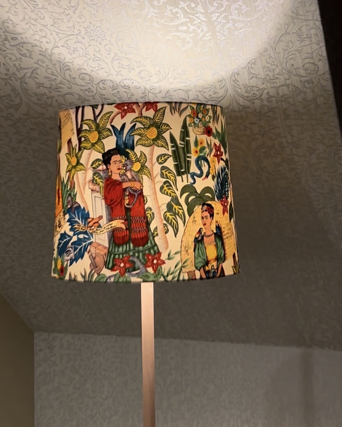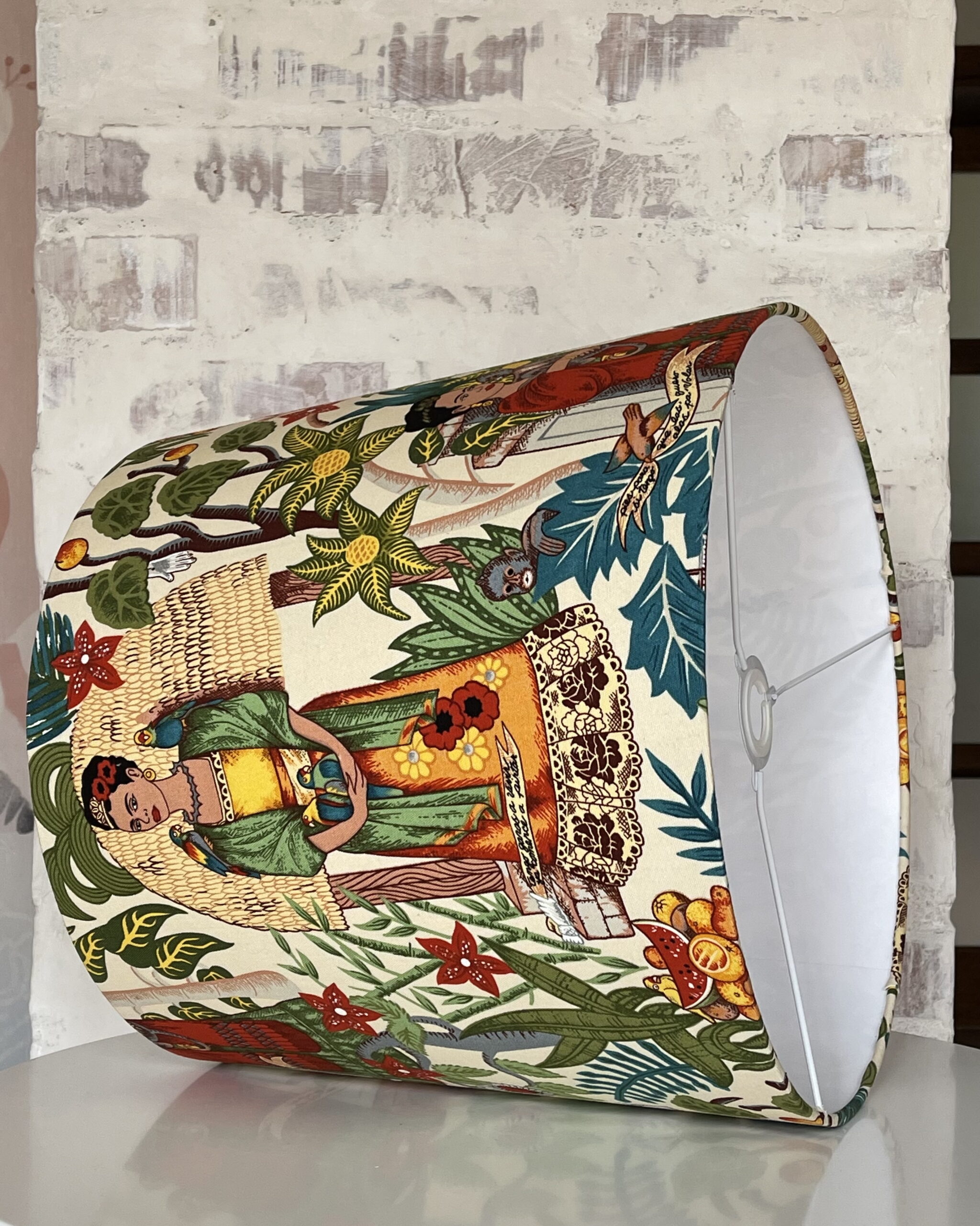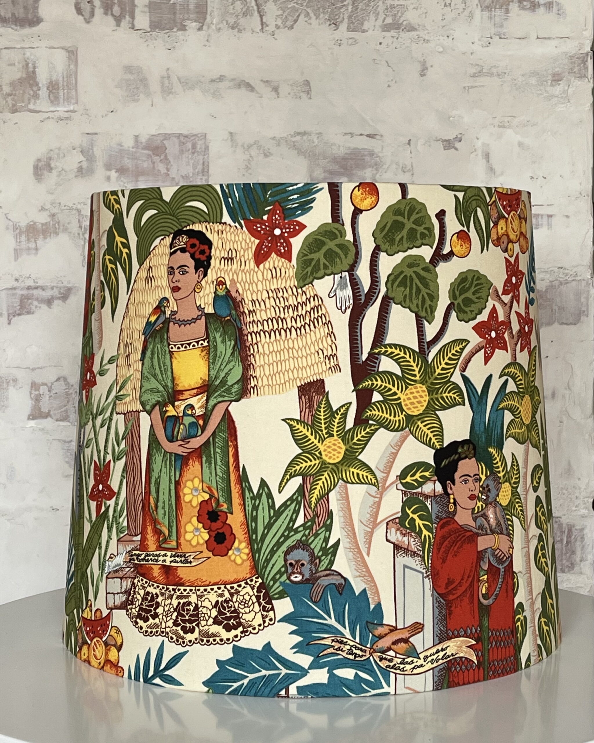Celebrate color, culture, and creativity with the Frida Kahlo Garden Tea Jungle Lampshade. This handcrafted lampshade features a vibrant tropical print inspired by the iconic Mexican artist, surrounded by lush greenery, bold flowers, and exotic birds. Rich in character and storytelling, it brings a joyful, bohemian flair to any space. Perfect for eclectic interiors, creative studios, or anyone who loves artful décor with a tropical twist. A true statement piece that transforms light into a celebration of nature and heritage.