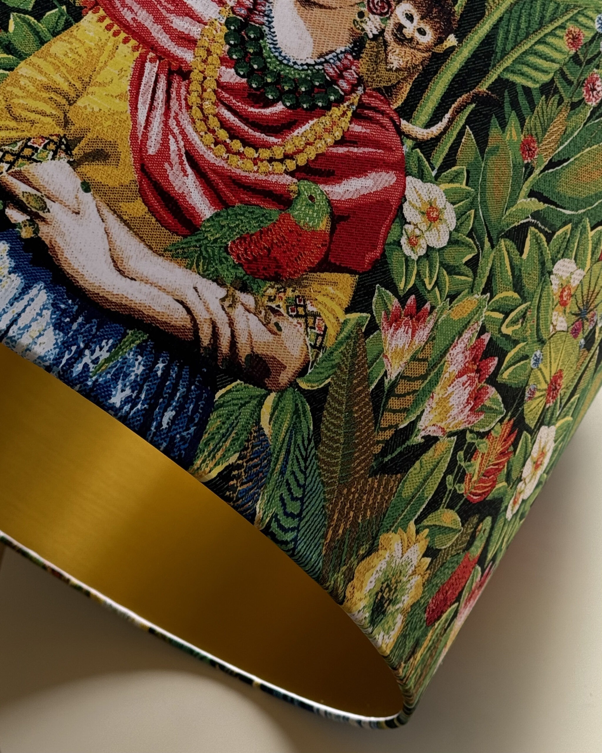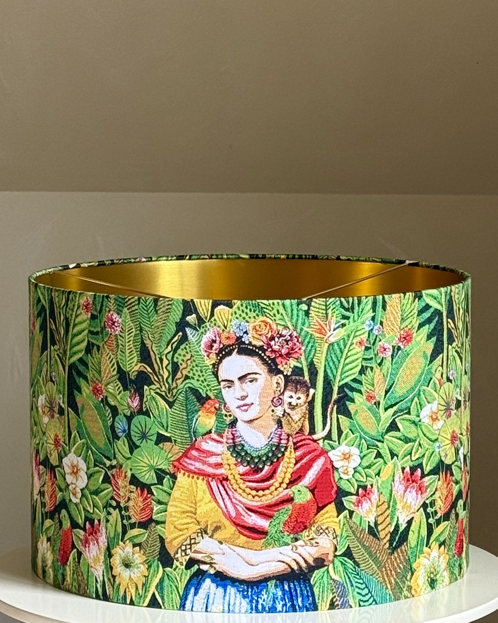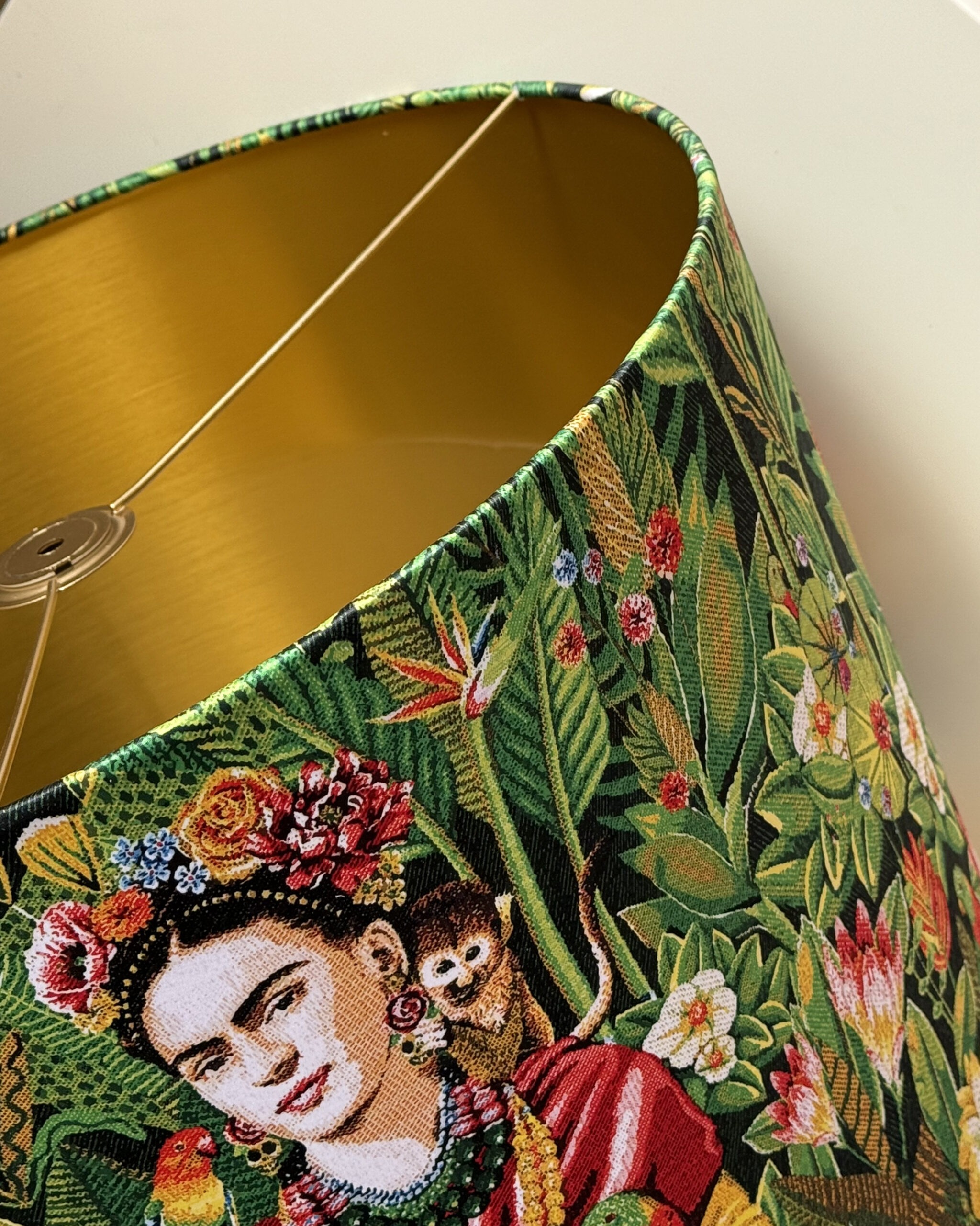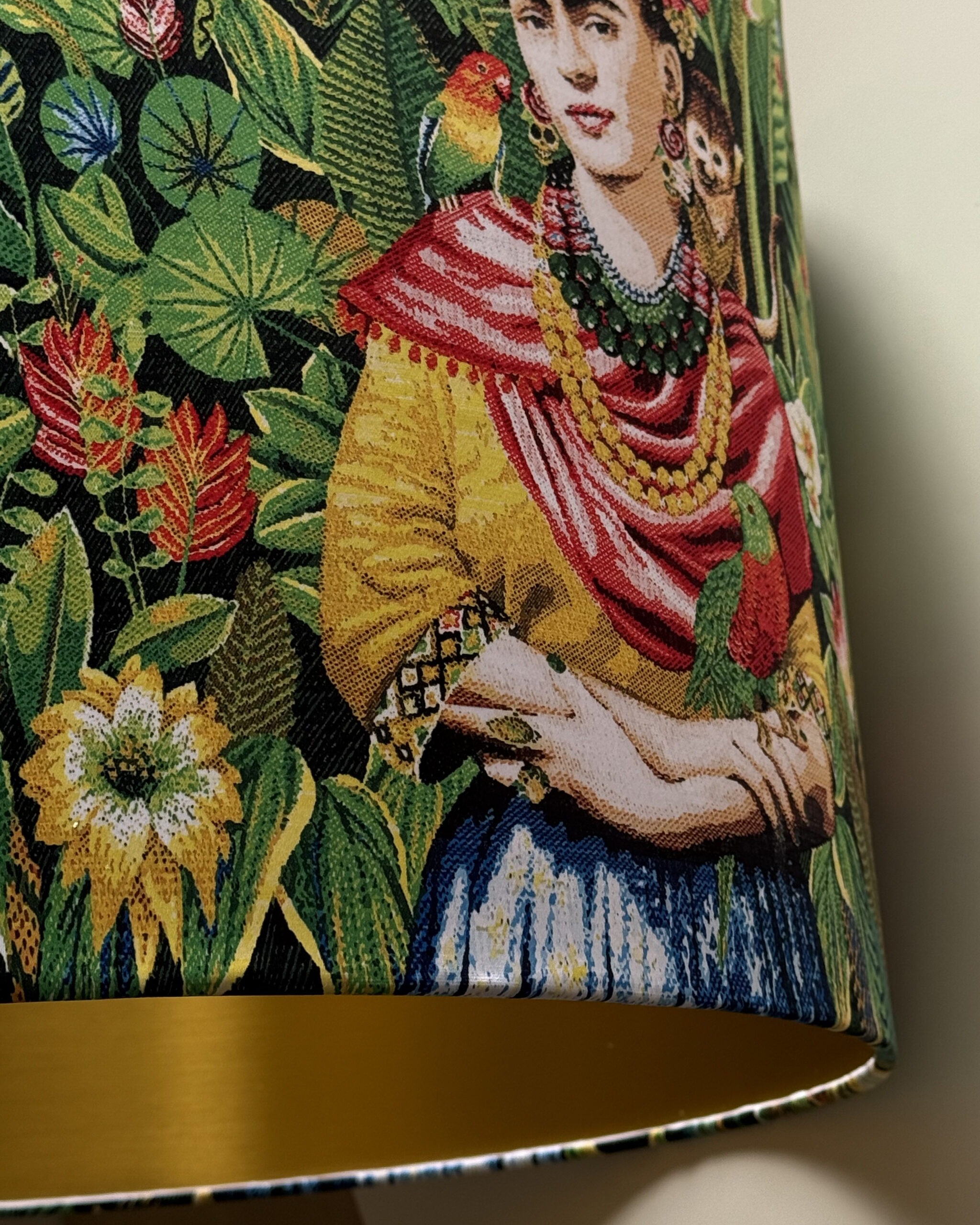 Illuminate your space with our handcrafted Frida Kahlo-inspired lampshade, featuring a vibrant tropical garden design and luxurious brushed gold lining. Perfect for adding a touch of artistic elegance to any room, this unique lampshade is crafted with precision and care. Available in multiple sizes to suit your needs. Explore our collection of artisan lampshades, designed to transform your home with timeless beauty and quality.