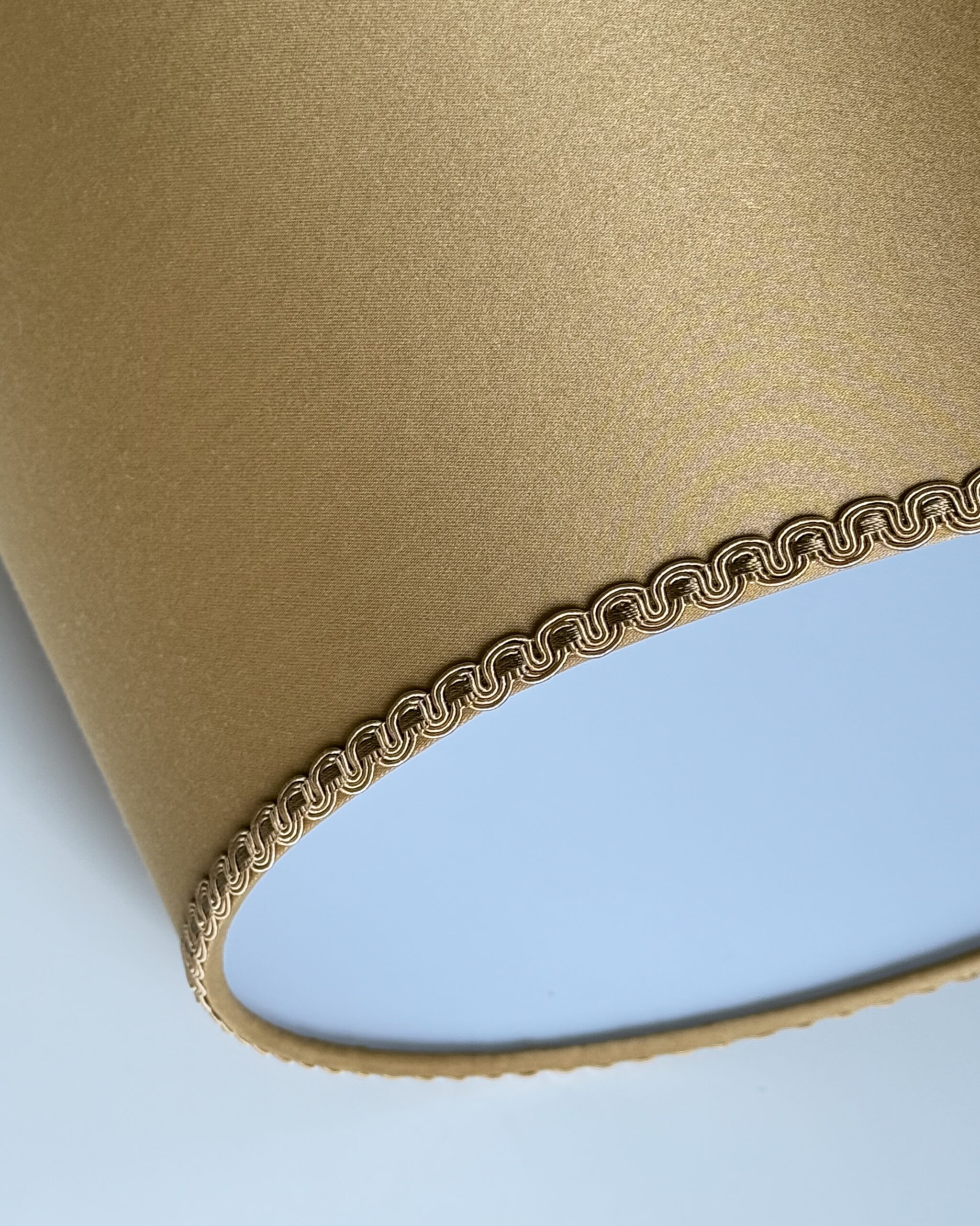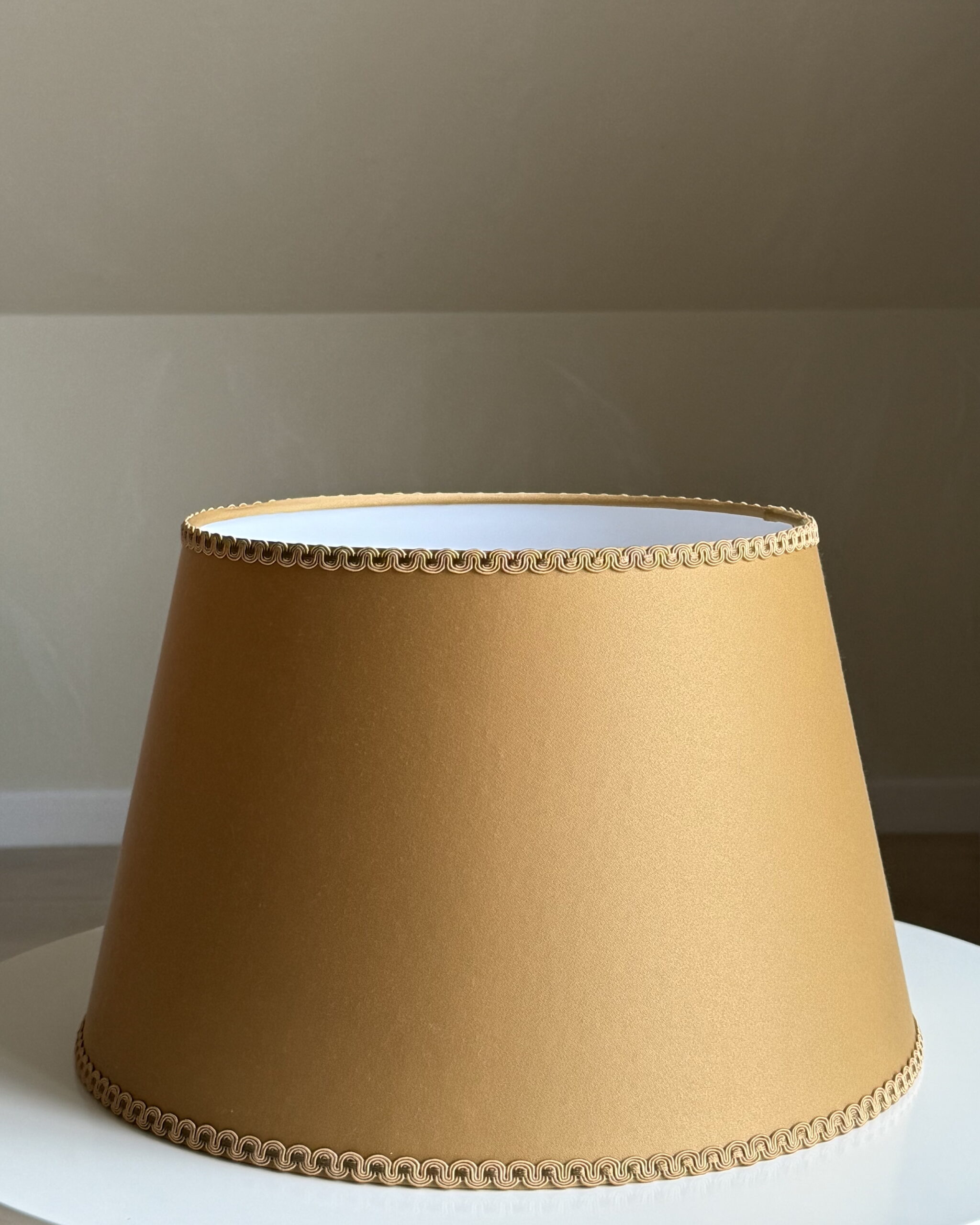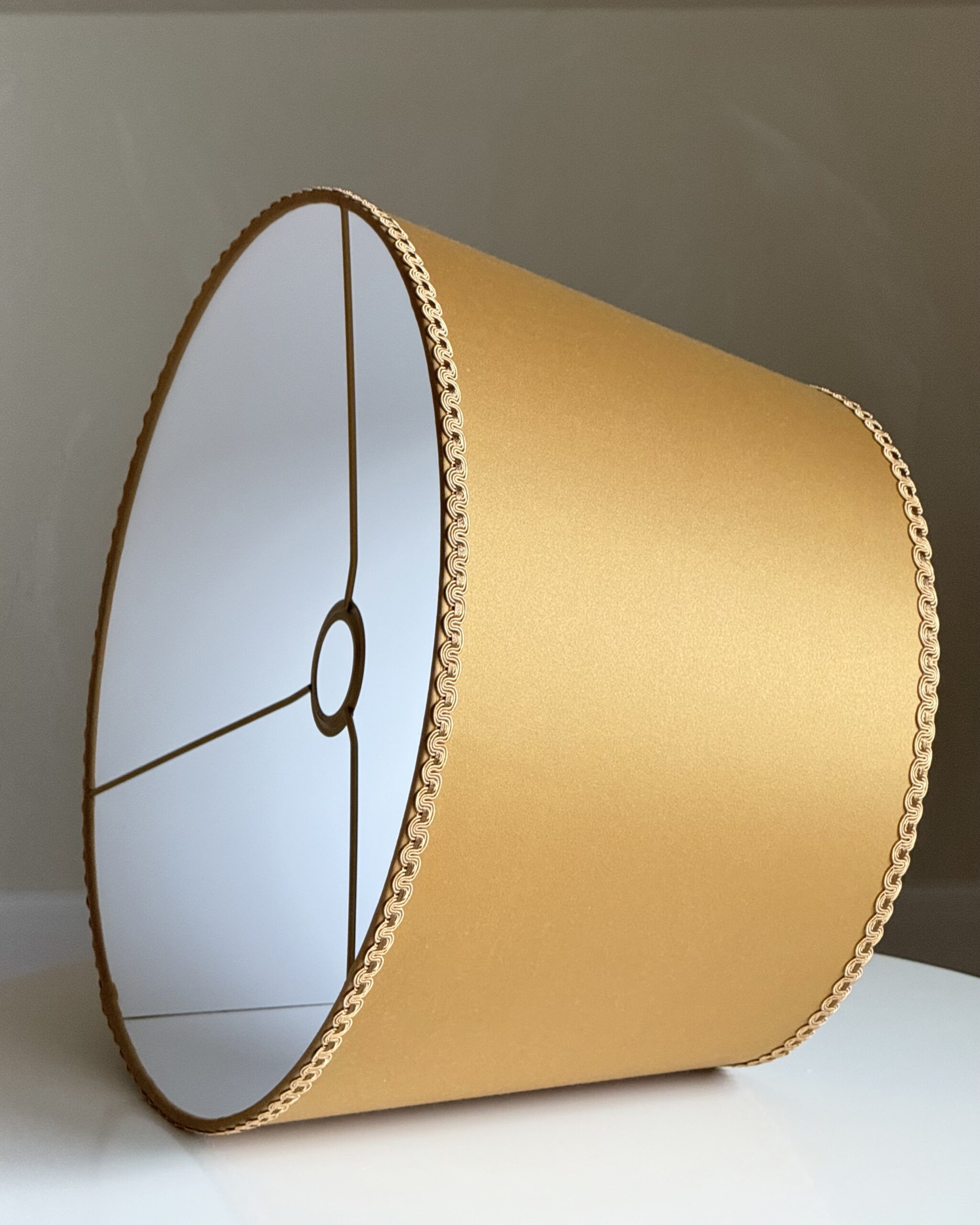 When your room needs a little golden magic, this handmade empire lampshade delivers. With its ochre satin sheen and detailed edge trim, it blends timeless style with cozy sophistication. Its timeless tapered shape and warm golden hue create a cozy, inviting atmosphere – perfect for both modern and classic interiors. Whether styled on a floor lamp or a statement table base, it adds a refined glow and handcrafted charm to any corner.