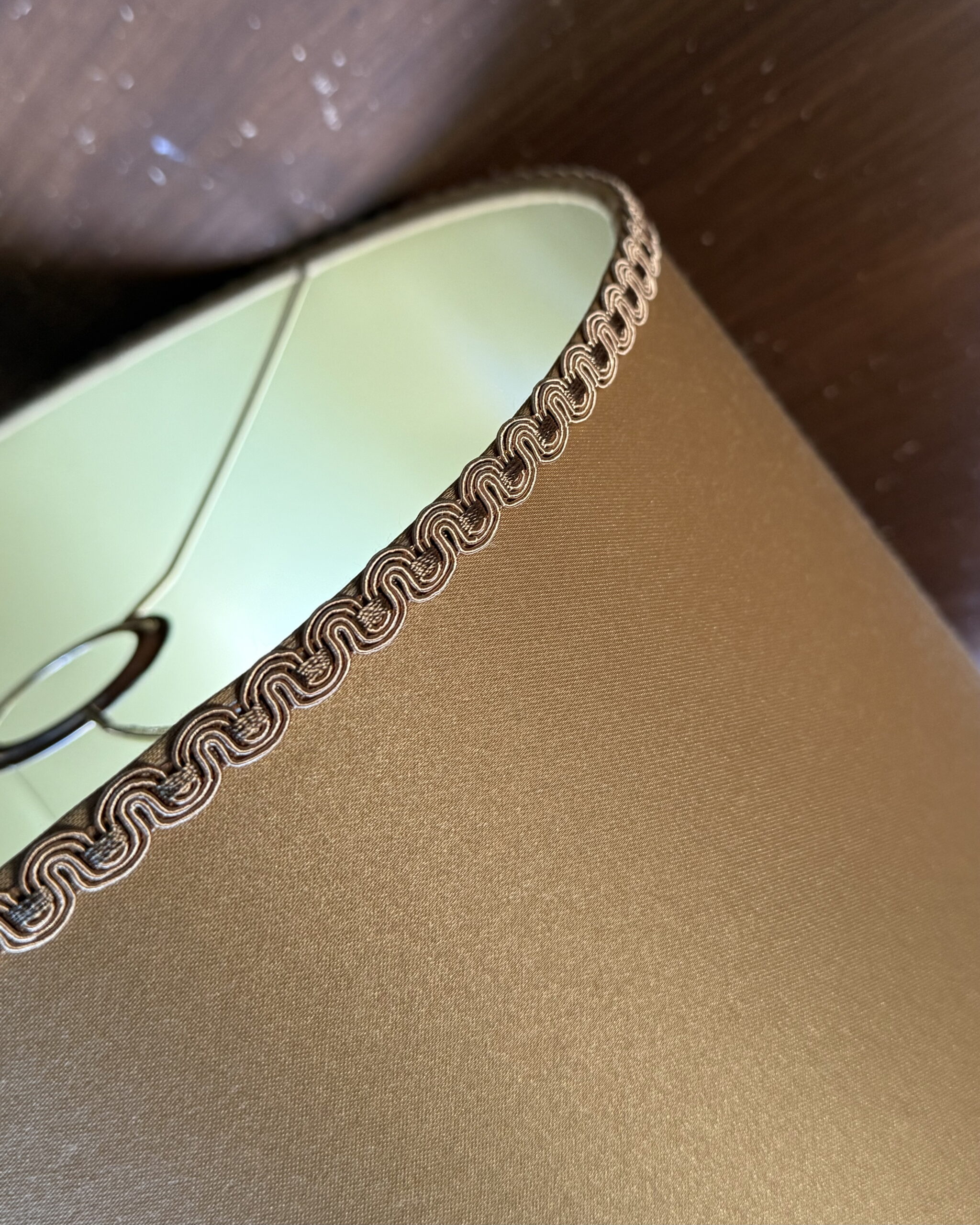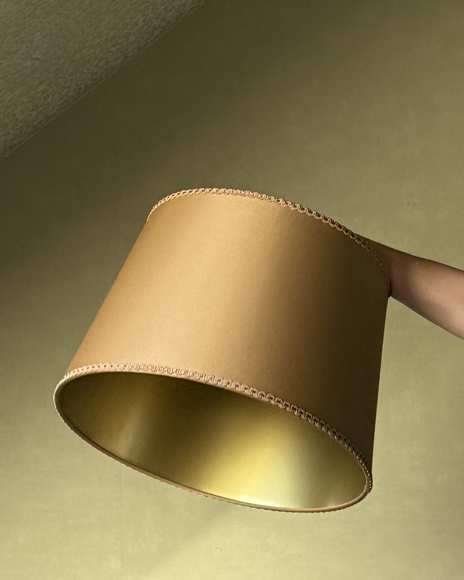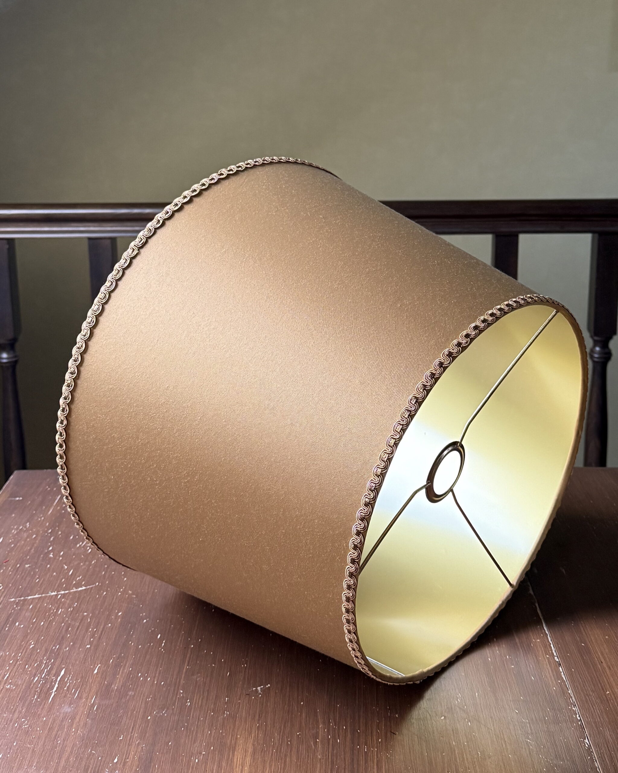 Our gold, silver, champagne and copper-lined lampshades are made using four layers of materials, including the metallic lining, PVC, and your chosen fabric or wallpaper. This ensures that the outer color stays rich and opaque. The light is directional and reflects off the metallic lining, creating a warm glow from the top and bottom of the shade. The amount of light emitted depends on the size of the lampshade—larger shades will provide more light.