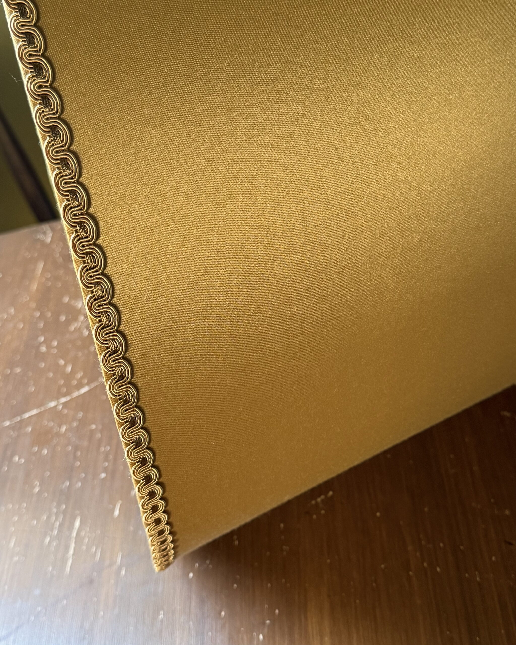 Warm, timeless, and full of character –  this Golden Ochre Fabric Empire Lampshade brings a soft glow to any room. The rich ochre fabric pairs beautifully with its matte Spanish gold lining, casting a golden light that feels both luxurious and inviting.