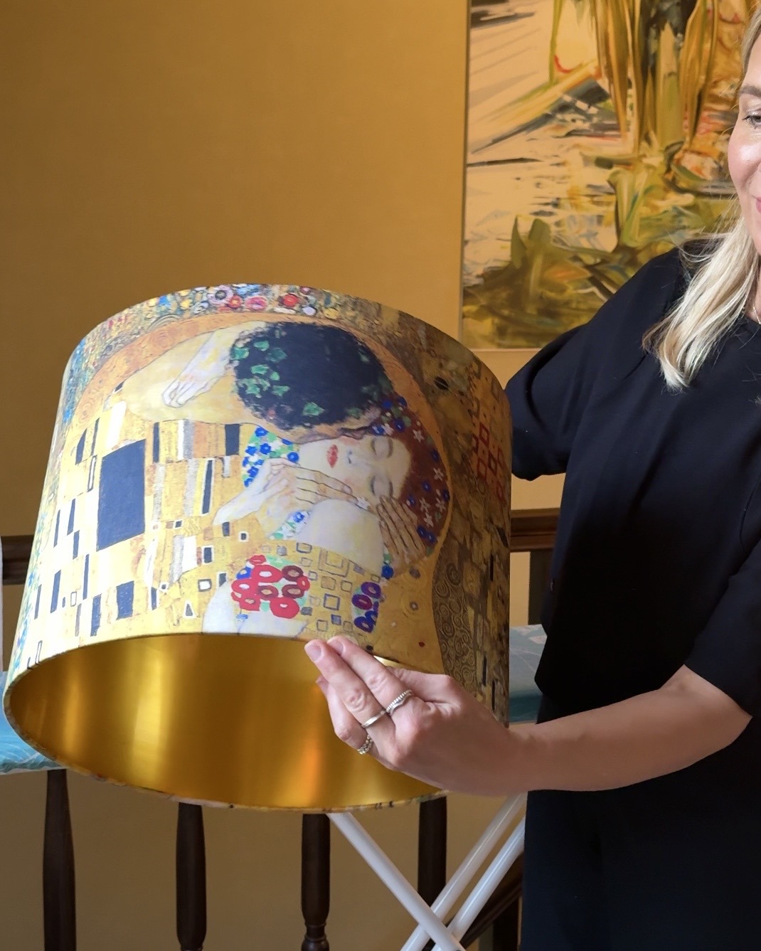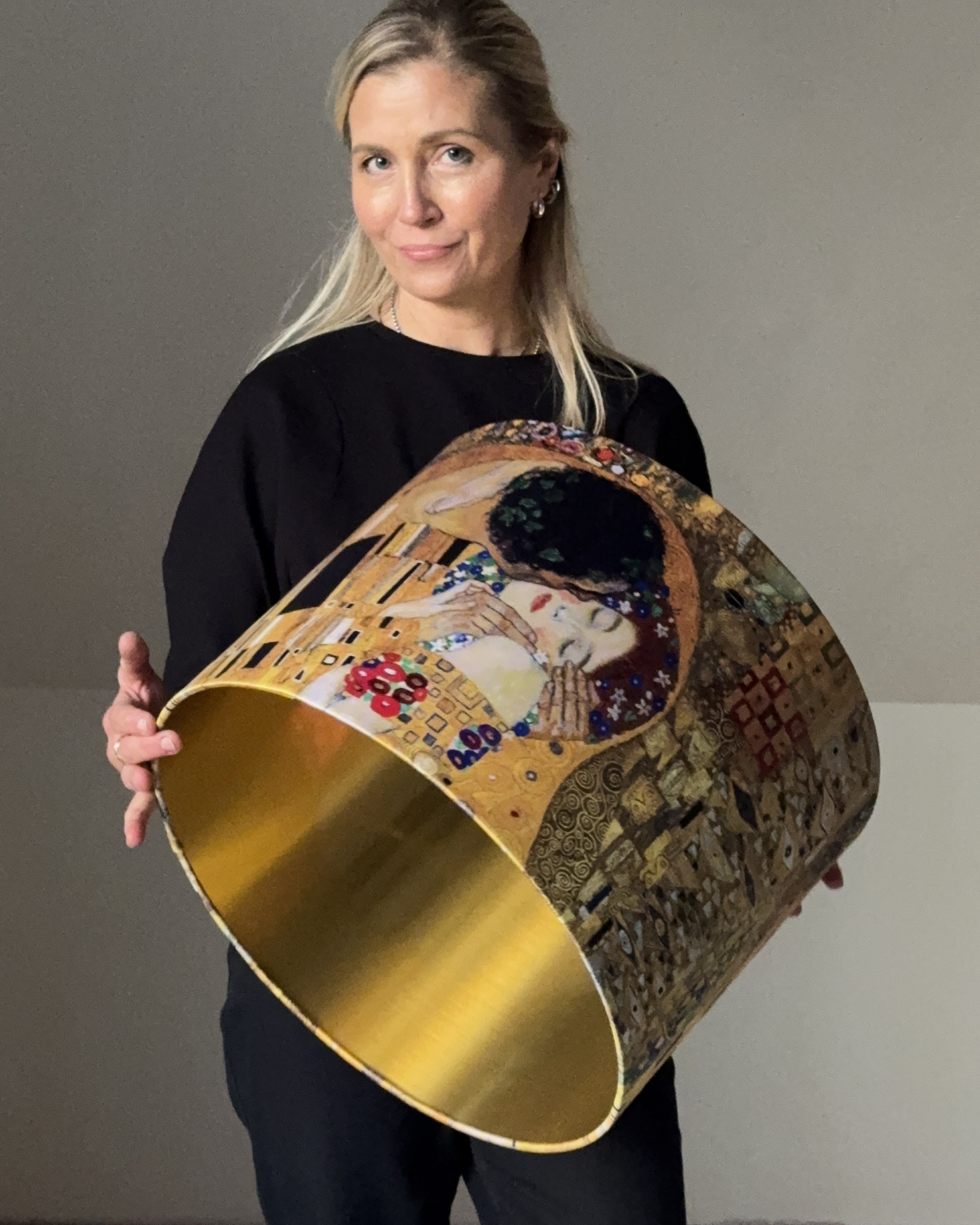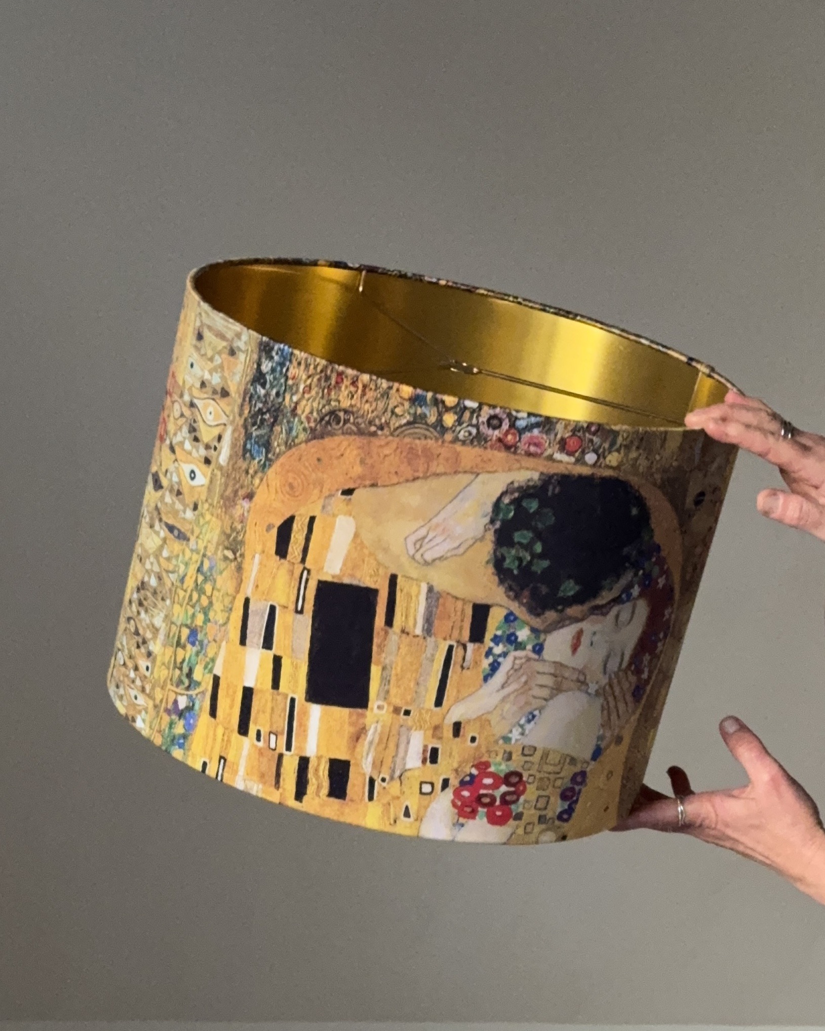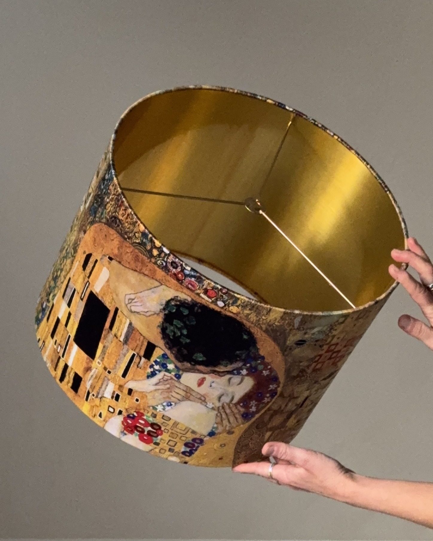 The exterior showcases Klimt’s legendary painting The Kiss with its rich gold tones, intricate patterns, and expressive details. Inside, a radiant brushed-gold lining amplifies the glow, casting a soft, atmospheric light that enhances both the artwork and your interior.