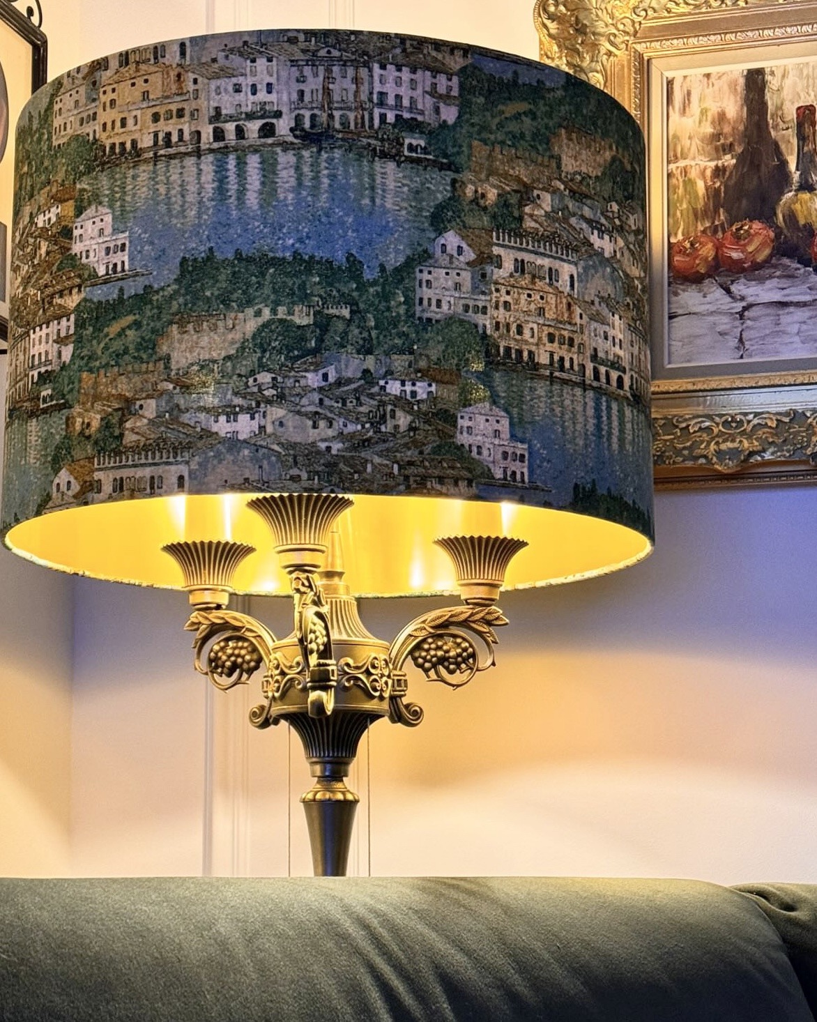 Inspired by the timeless artistry of Klimt, this Garda Lake Lampshade brings an elegant touch to any space. Featuring a scenic Italian lakeside view, this lampshade is beautifully lined with brushed gold, creating a warm, luxurious glow when illuminated. Perfect for those seeking unique, art-inspired lighting solutions, it adds sophistication and style to any decor.