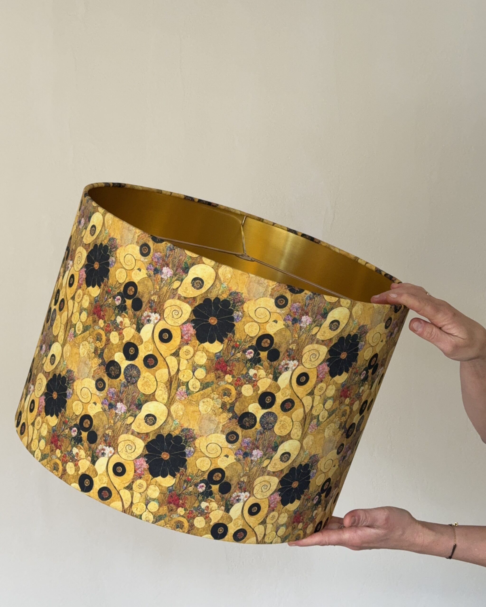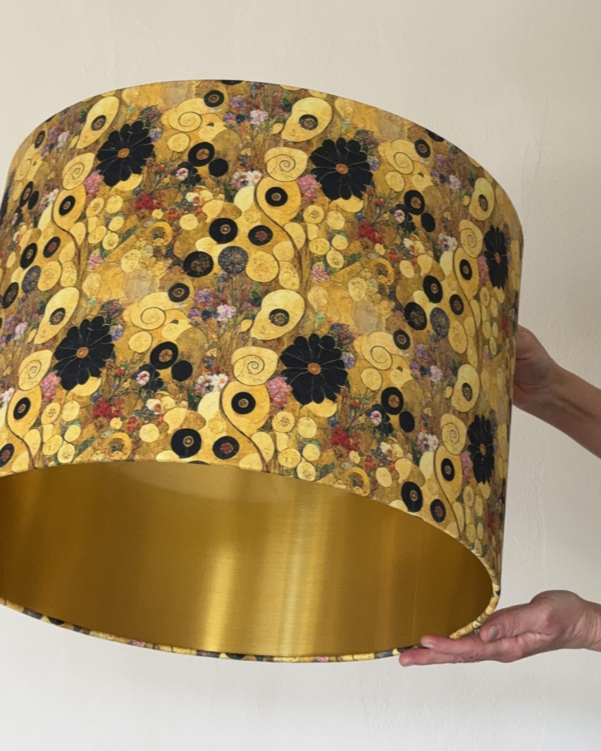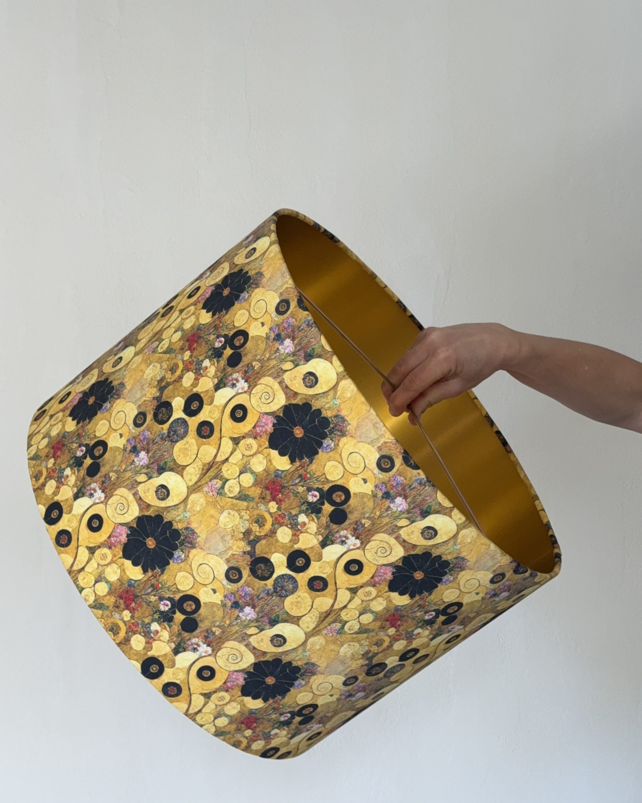 The Klimtesque Floral Gold Lined Artistic Lampshade is inspired by the ornamental beauty and golden tones of Gustav Klimt’s work. Rich floral motifs, circular details, and layered textures create a visually captivating surface that feels both artistic and timeless.