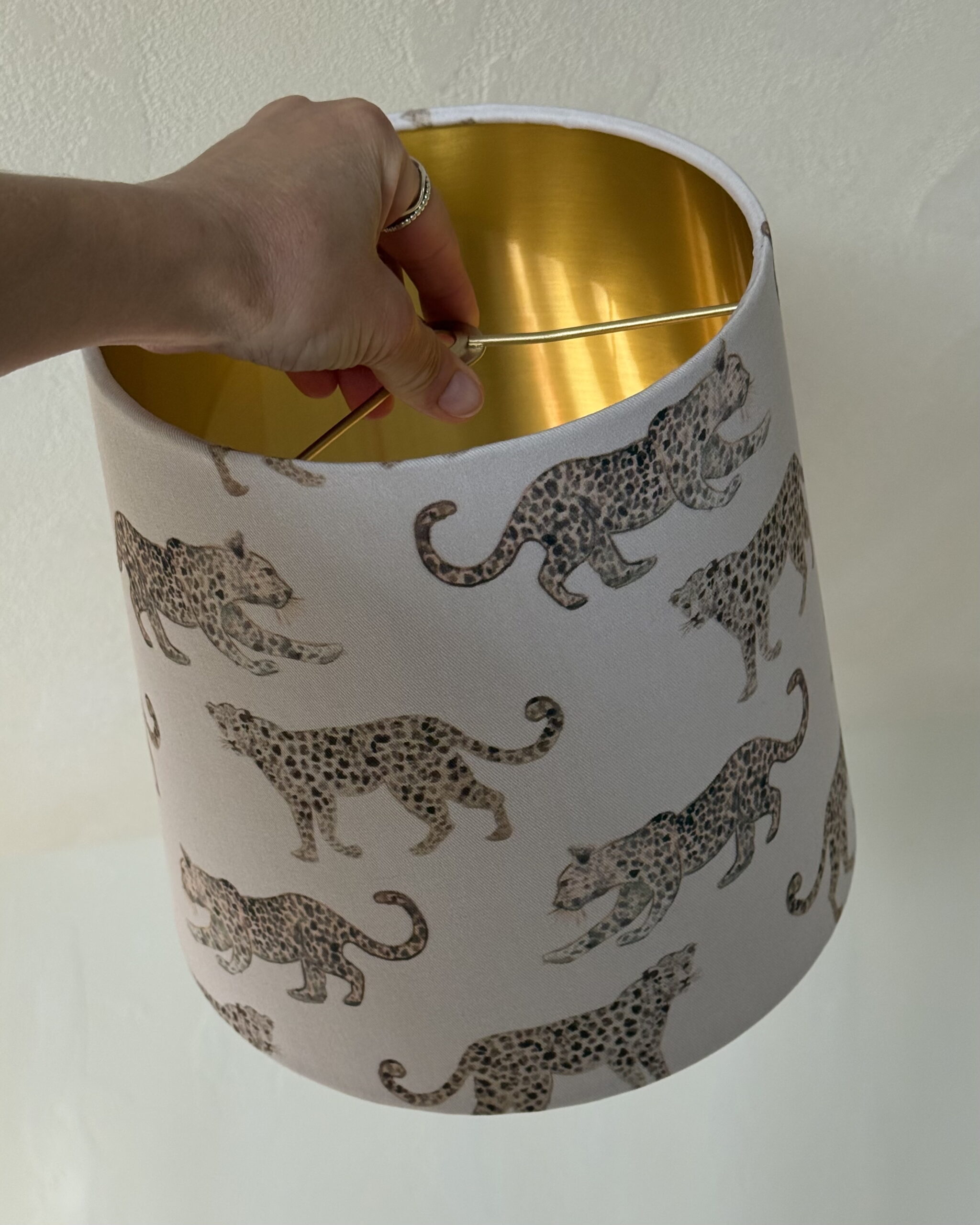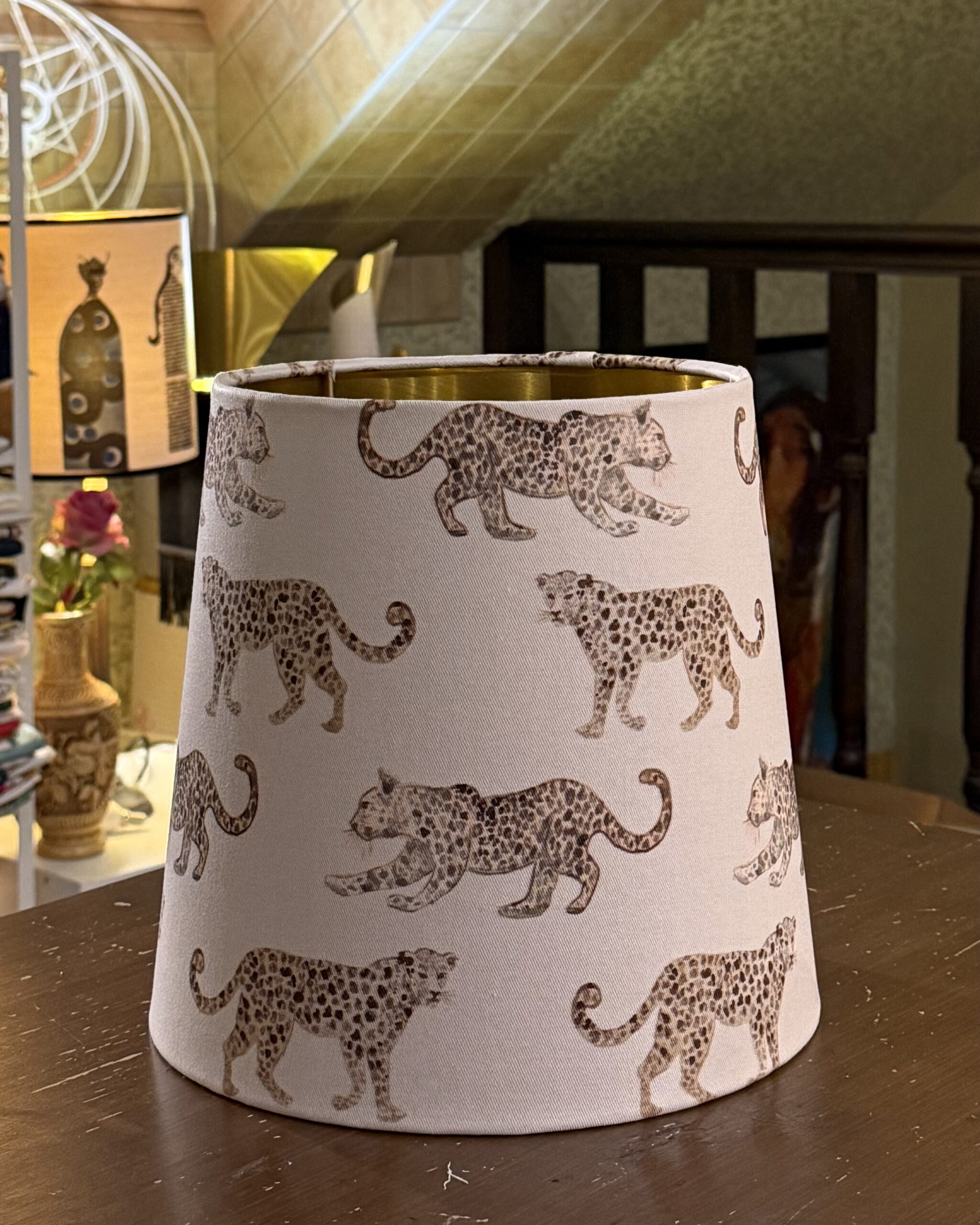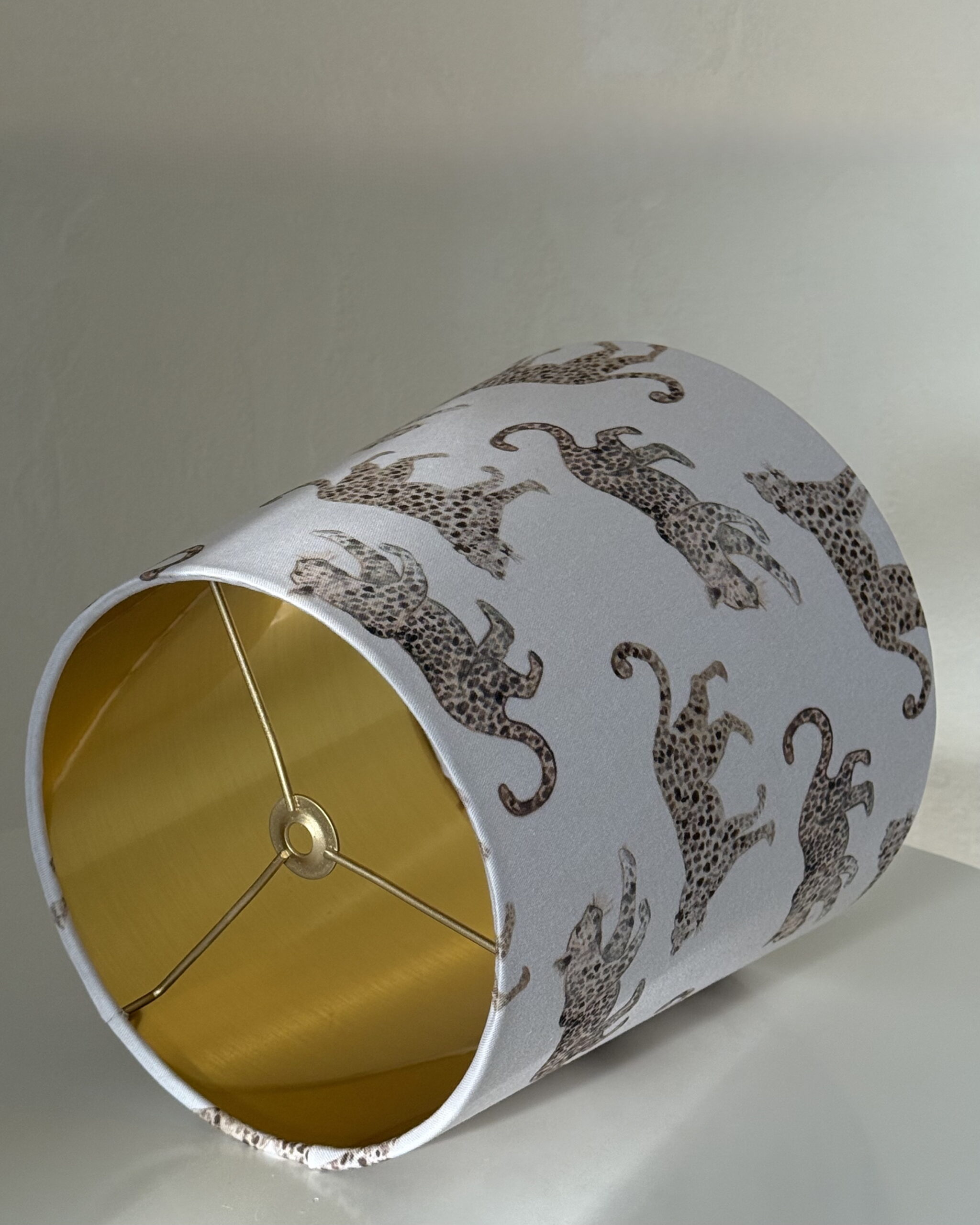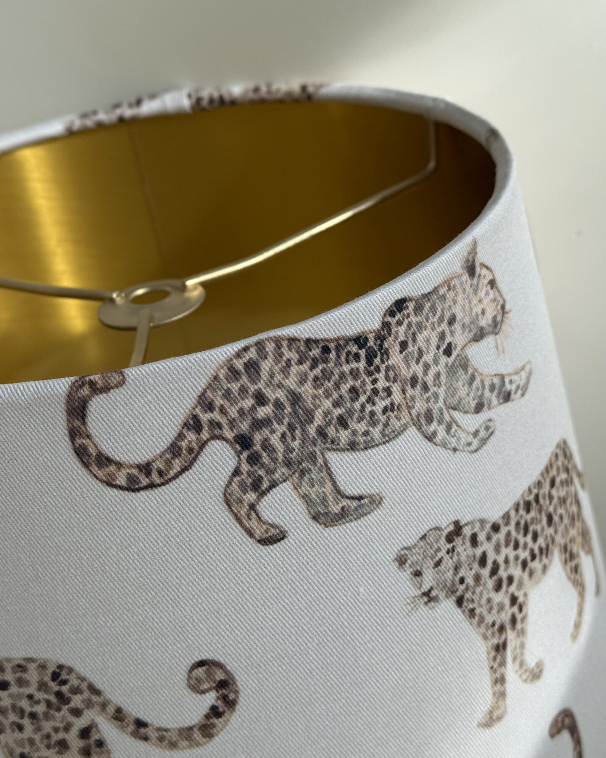 The Leopard Parade empire lampshade with brushed gold lining is a refined lighting piece that combines playful pattern with classic elegance. The exterior fabric features gracefully moving leopards arranged in a repeating parade, creating rhythm, balance, and visual interest while remaining soft and sophisticated in tone.