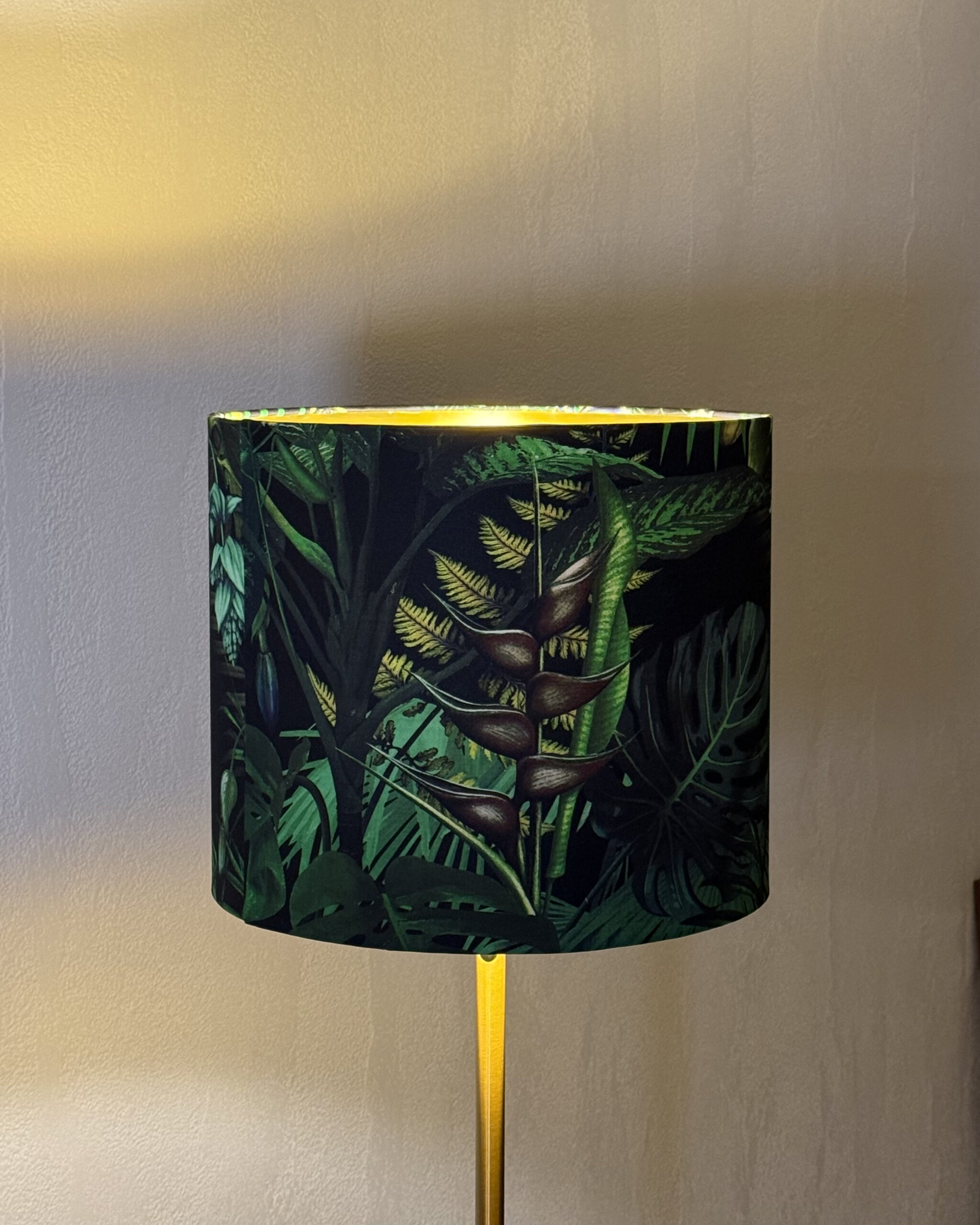 Our gold, silver, champagne and copper-lined lampshades are made using four layers of materials, including the metallic lining, PVC, and your chosen fabric or wallpaper. This ensures that the outer color stays rich and opaque. The light is directional and reflects off the metallic lining, creating a warm glow from the top and bottom of the shade. The amount of light emitted depends on the size of the lampshade—larger shades will provide more light.
