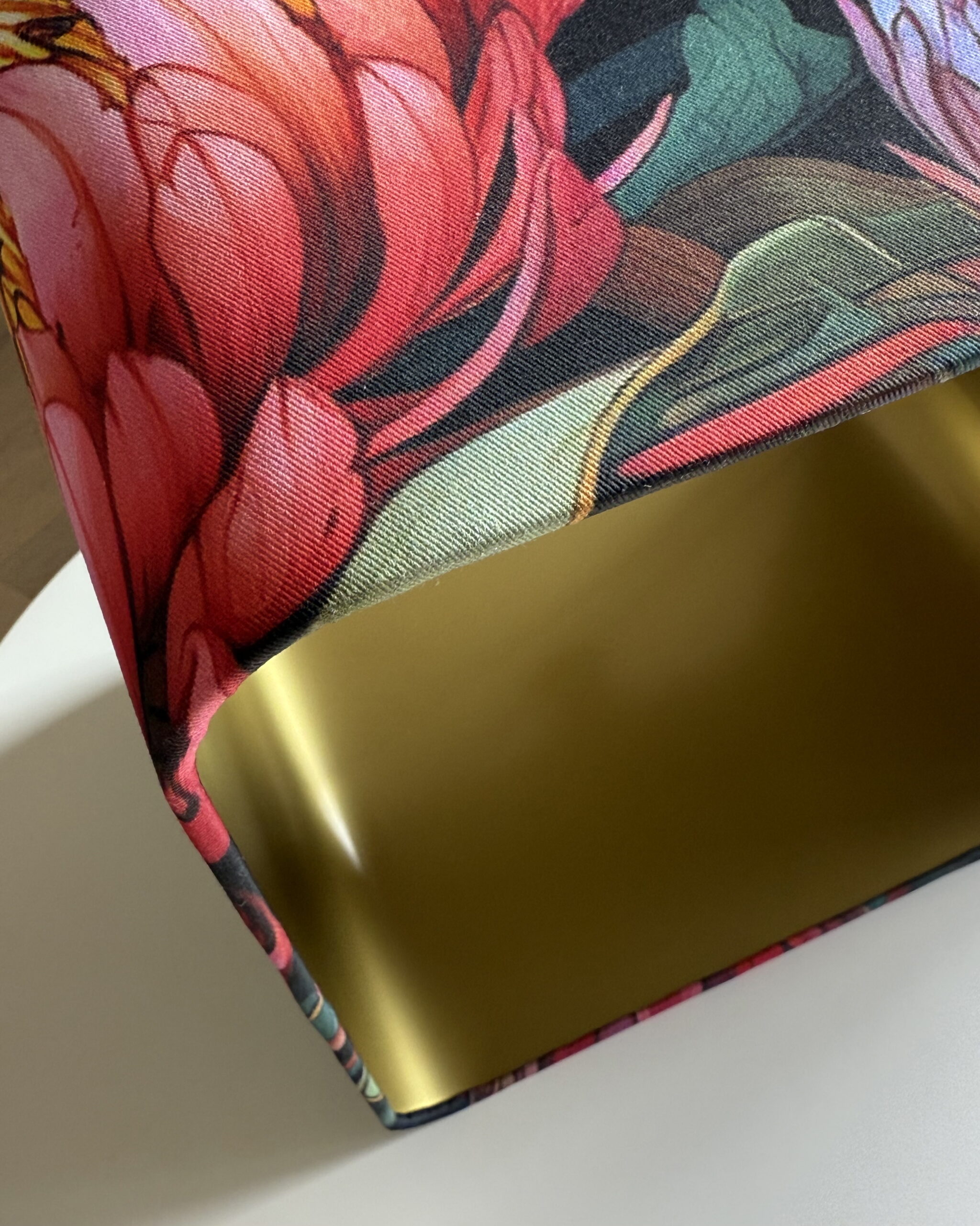 Our gold, silver, champagne and copper-lined lampshades are made using four layers of materials, including the metallic lining, PVC, and your chosen fabric or wallpaper. This ensures that the outer color stays rich and opaque. The light is directional and reflects off the metallic lining, creating a warm glow from the top and bottom of the shade. The amount of light emitted depends on the size of the lampshade—larger shades will provide more light.