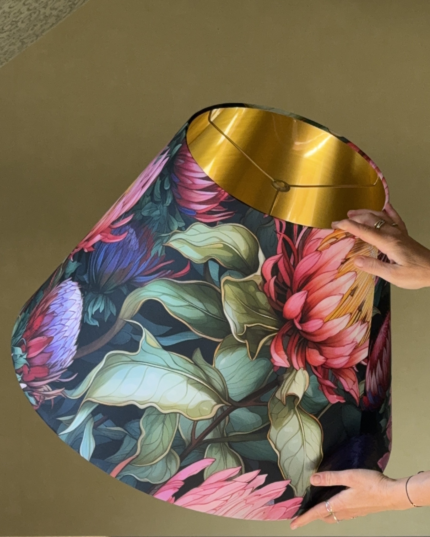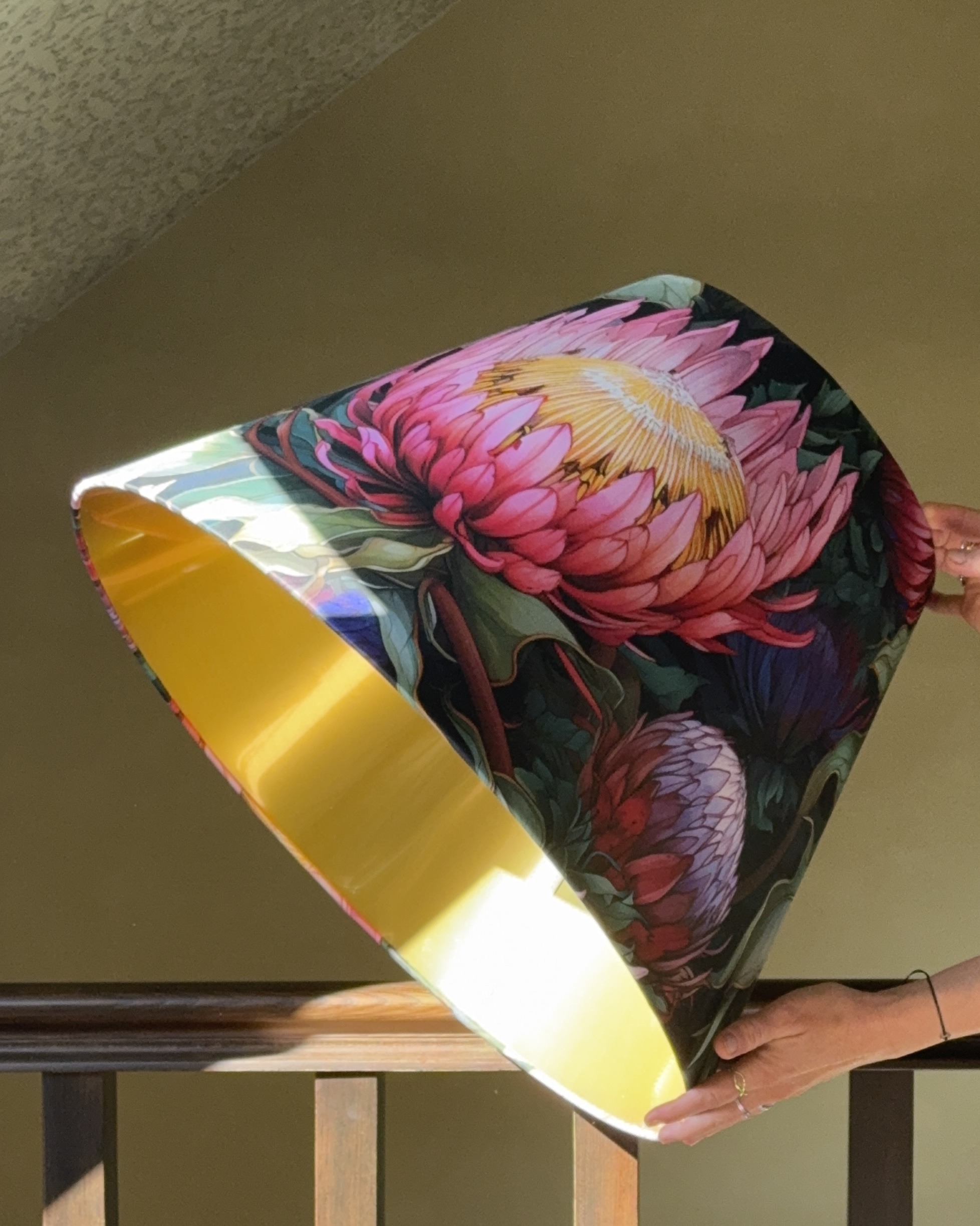 Make a statement with the Protea Elegance Tapered Lampshade Lined Brushed Gold. Featuring bold protea flowers in vibrant pinks and greens, this lampshade celebrates nature’s beauty in a truly luxurious way. The tapered silhouette creates a refined shape, while the brushed gold lining casts a warm, golden glow that transforms any space with elegance and depth.