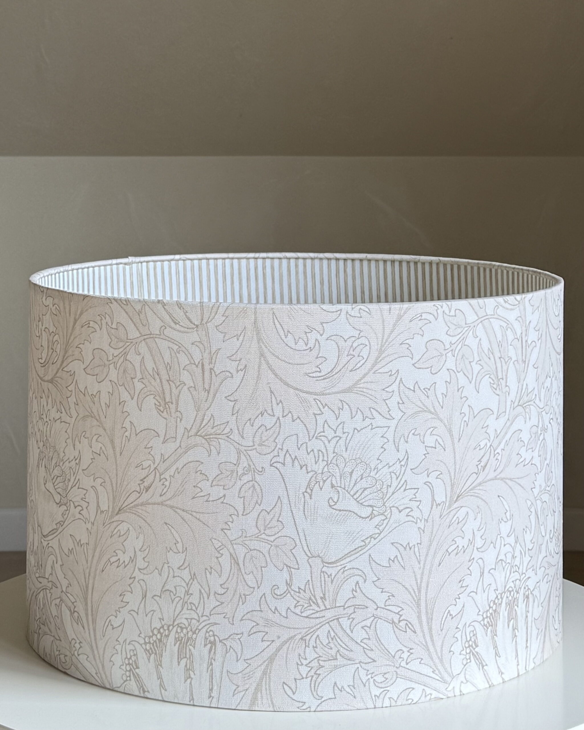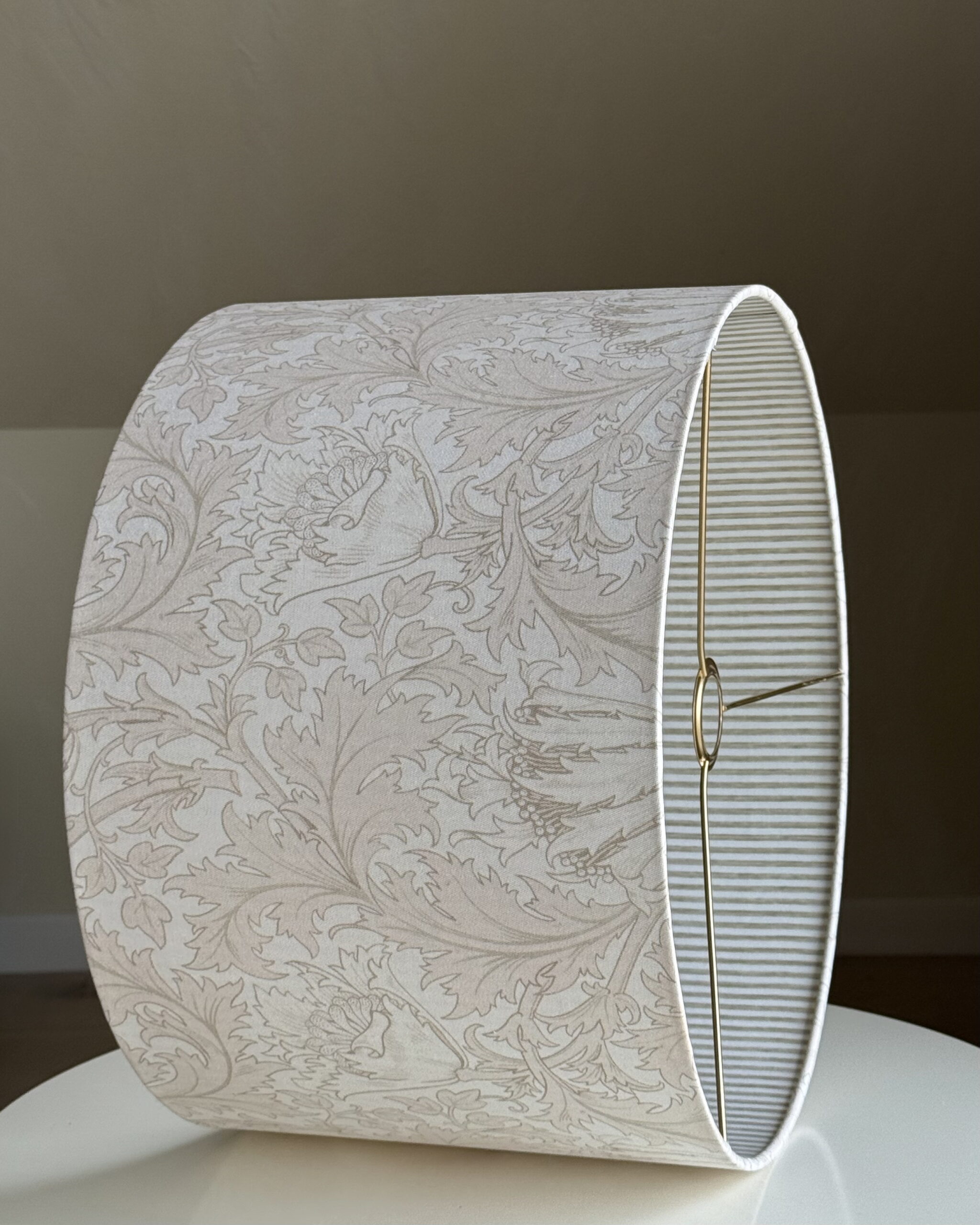 Add timeless charm to your home with this William Morris Anemone Lampshade, featuring the iconic floral design in a soft antique white palette. The double-sided construction reveals a refined striped interior, creating a subtle play of patterns and texture when the light is on. Whether styled in a modern or classic setting, this lampshade brings depth, elegance, and artisan craftsmanship to any room.