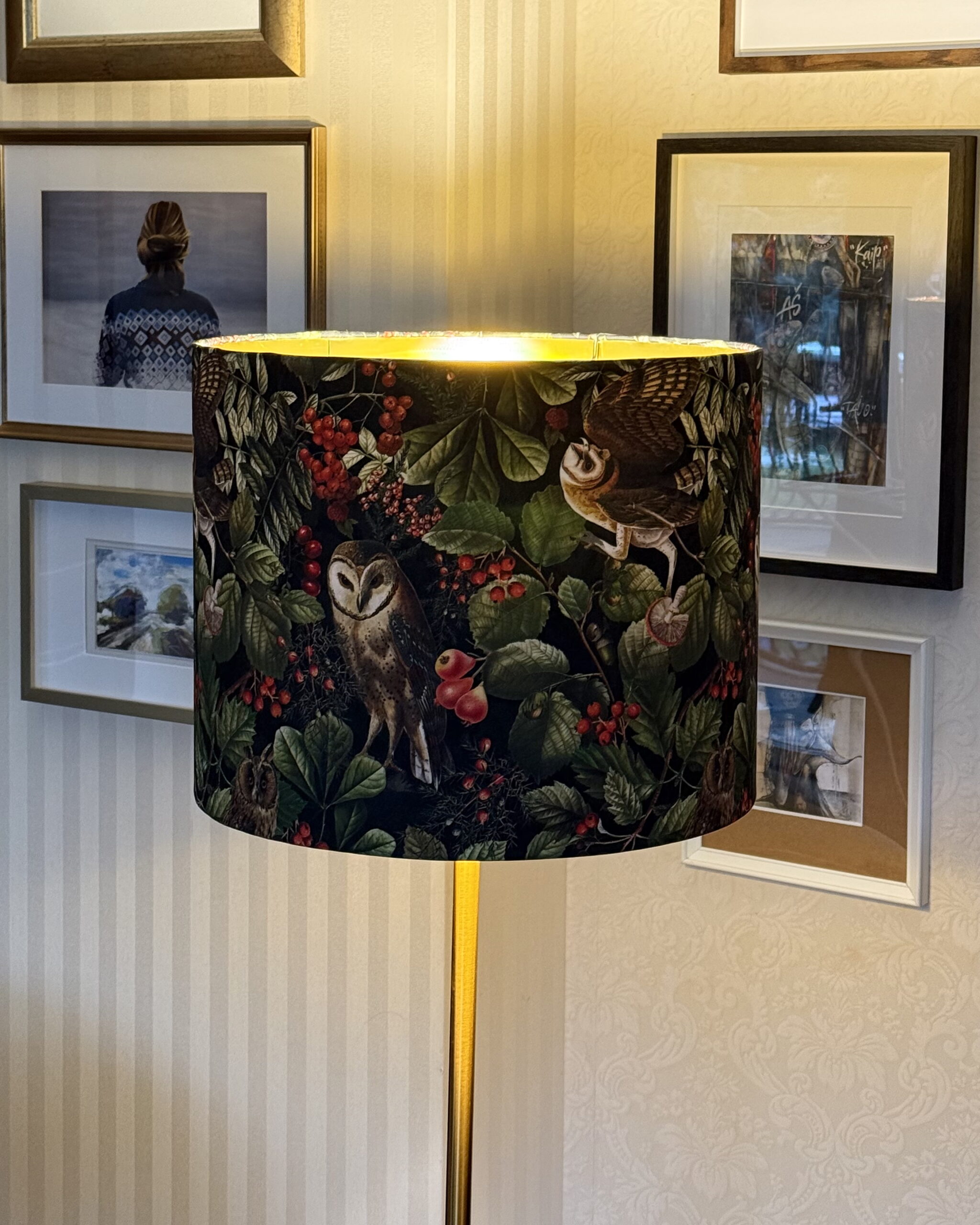 The Woodland Owl Lampshade with Brushed Gold Lining is a refined lighting piece inspired by the quiet beauty of woodland landscapes. The exterior features owls nestled among leaves, berries, and branches. These details create an atmospheric design that feels timeless and evocative.