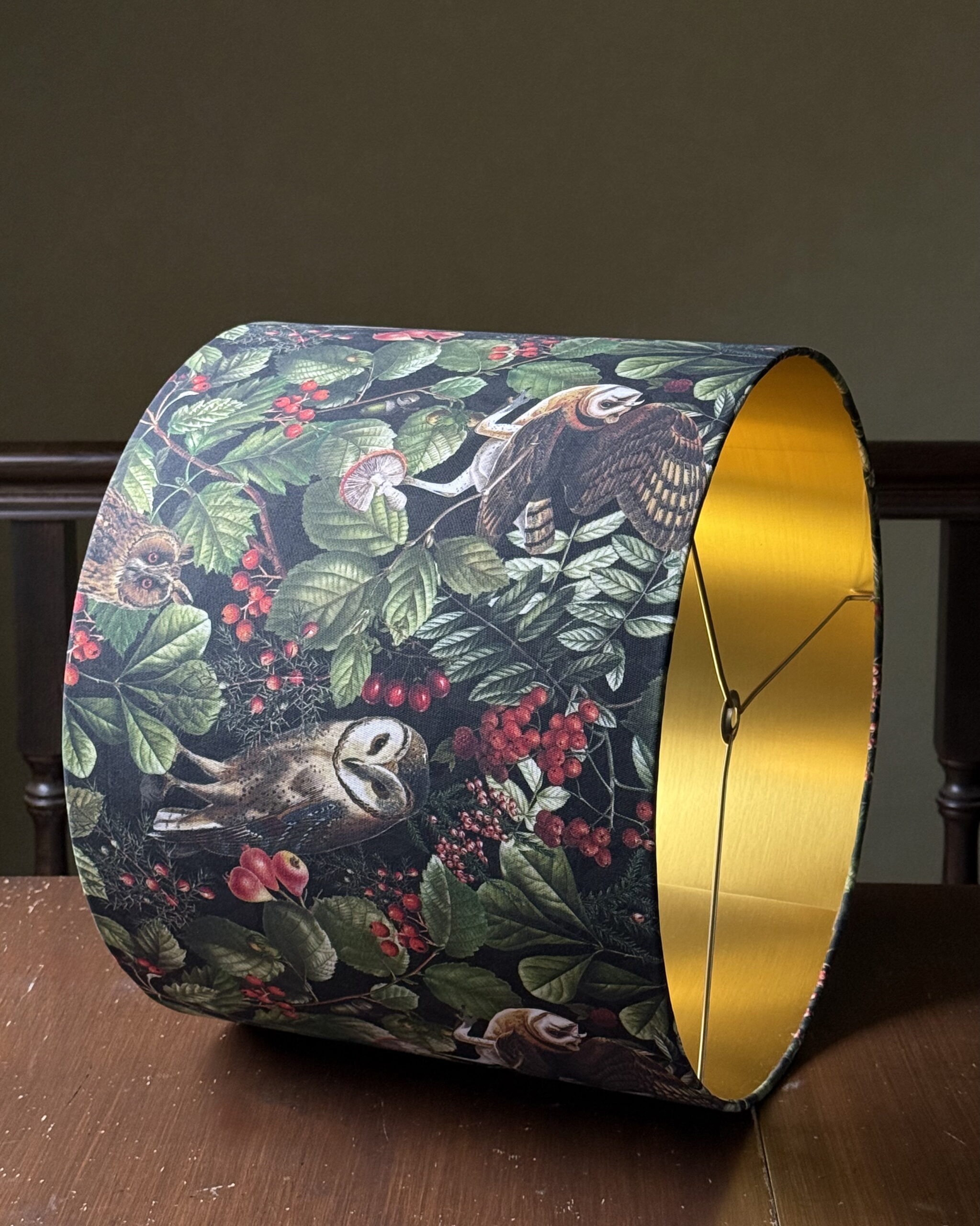 The woodland owl lampshade with brushed gold lining is more than a lighting accessory. It transforms light into atmosphere. In doing so, it adds personality, calm, and visual richness to thoughtfully curated interiors.