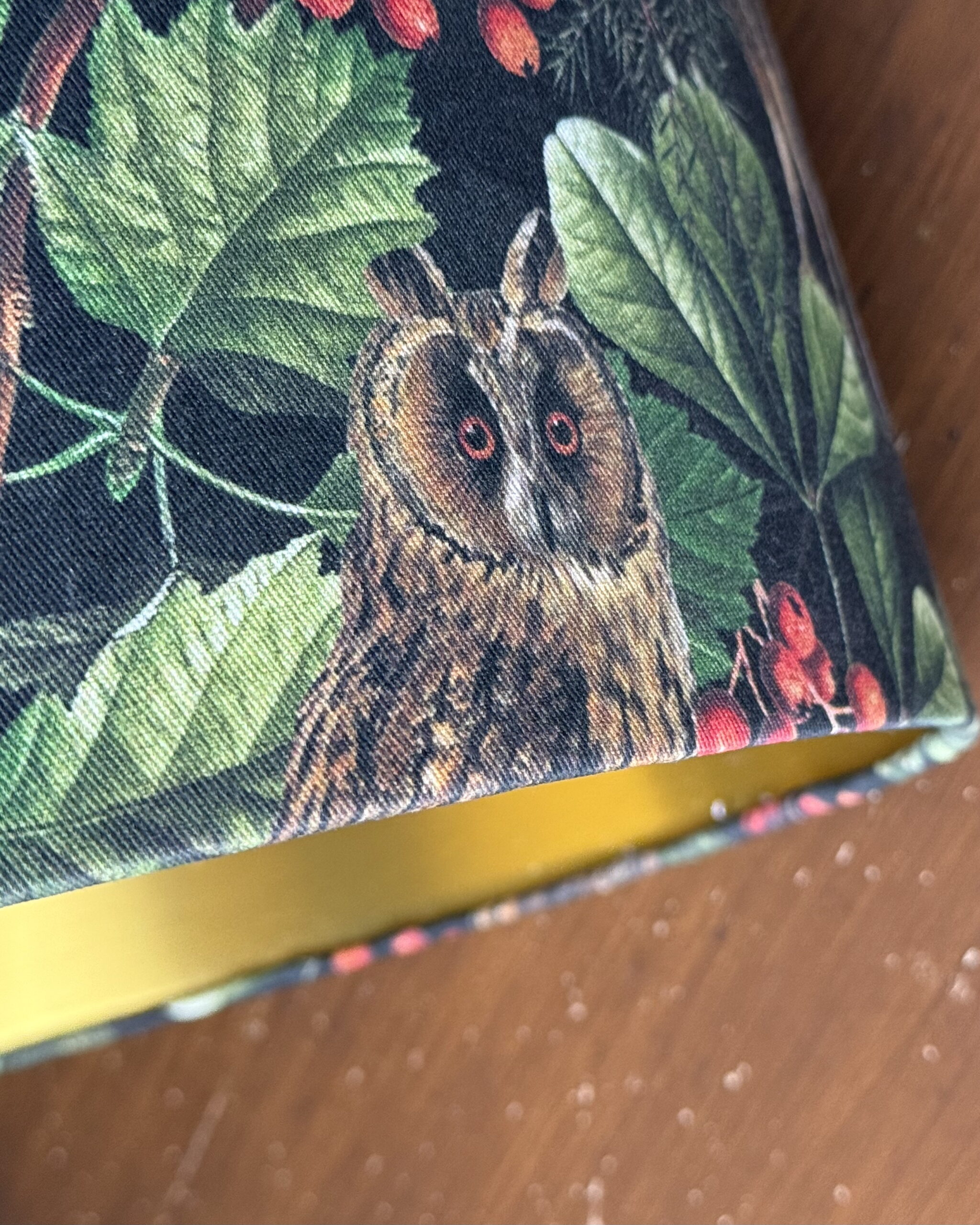 This woodland owl lampshade is designed to work beautifully on table lamps, floor lamps, and bedside lamps. Its proportions are carefully considered to ensure a harmonious relationship between the lampshade and the lamp base.